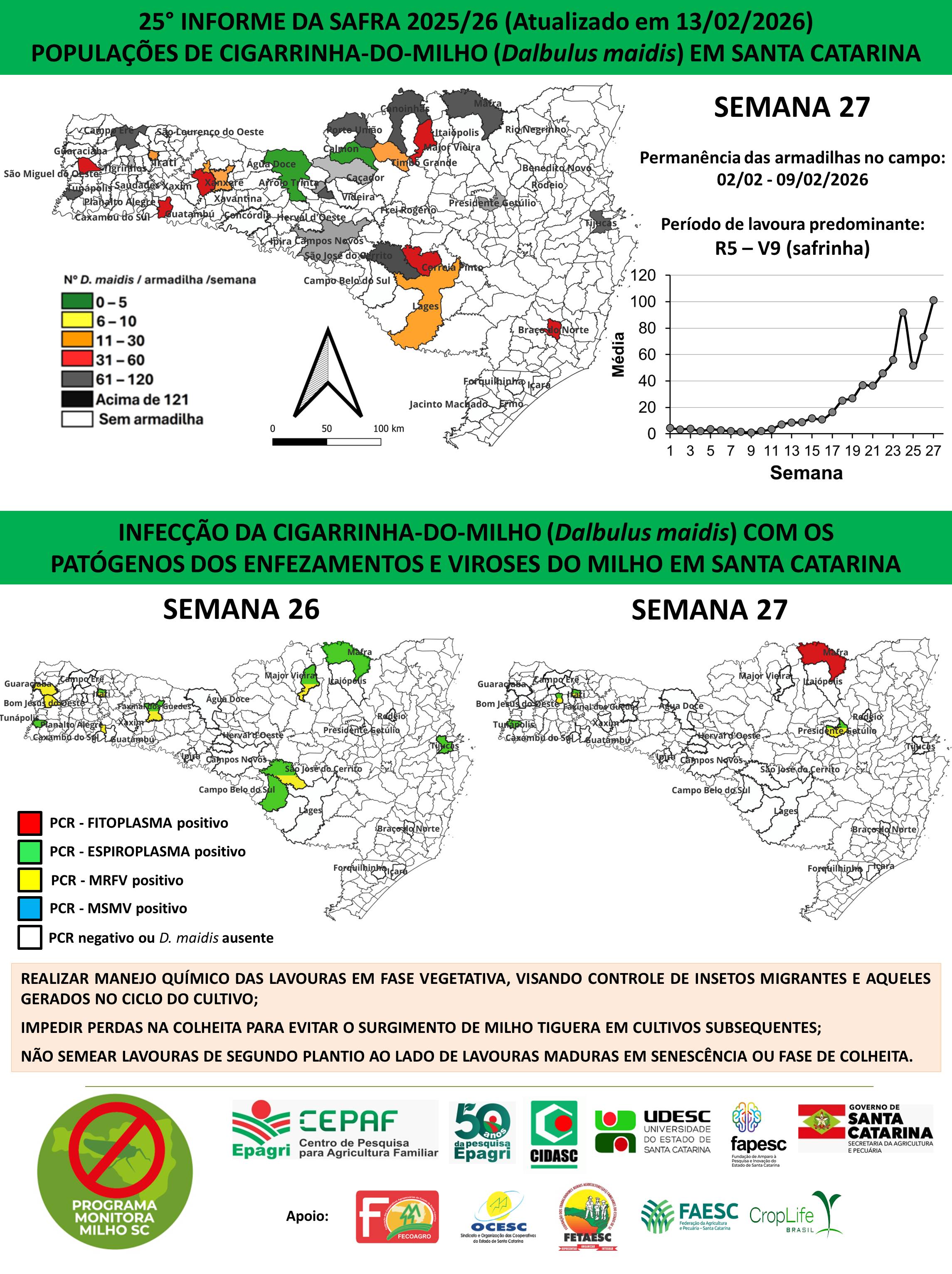 No dia 13 de fevereiro de 2026 divulgou-se o 25° informe do monitoramento da cigarrinha do milho e de sua infecção pelos patógenos causadores dos enfezamentos, referente à safra 2025/26. O Programa Monitora Milho SC acompanha em torno de 50 lavouras distribuídas em todas as regiões de Santa Catarina. As lavouras do primeiro plantio estão em fase final do ciclo sendo colhidas, e as lavouras de segundo plantio - safrinha - estão em fase vegetativa. Observa-se que a população da cigarrinha está grande neste início de safrinha - já observou-se uma média de 100 insetos por armadilha por local. É importante frisar que é possível manter o nível populacional de insetos neste nível ou até mais baixo, adotando-se o manejo inicial da lavoura ainda em seu período vegetativo por meio do uso de inseticidas. Deve-se manter a atenção durante este momento do plantio safrinha, porque as cigarrinhas que estão em lavouras maduras tendem a migrar para lavouras novas, recém germinadas ou em estádios bem iniciais de desenvolvimento. O período realmente crítico ocorre justamente agora, do surgimento da planta (VE) até os estádios iniciais, como V3-V4, quando ao se alimentar, a cigarrinha transmite os patógenos, e a infecção pode se espalhar por toda a planta e afetar a formação da espiga durante o período reprodutivo da planta, gerando as perdas de produtividade.
