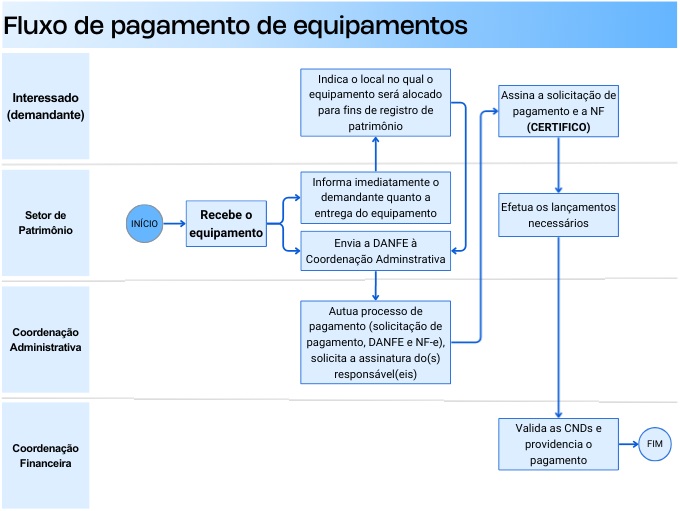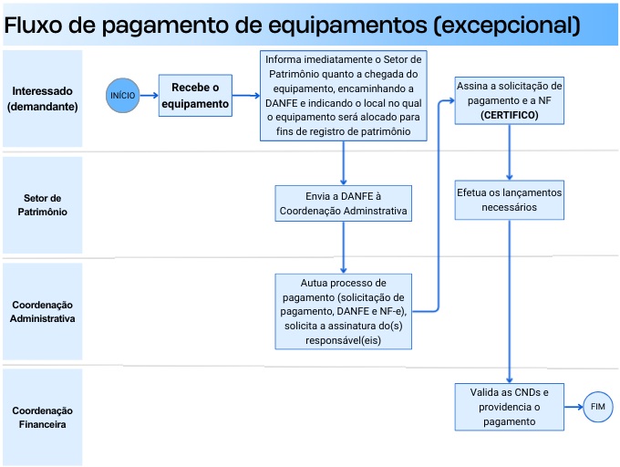 No caso de eventuais entregas de equipamentos realizadas diretamente aos interessados, ficam mantidos os prazos e o fluxo a ser seguido passa a ser o seguinte: FLUXO ALTERNATIVO (EXCEÇÕES)