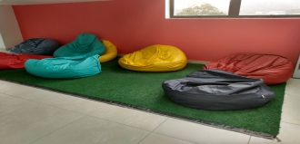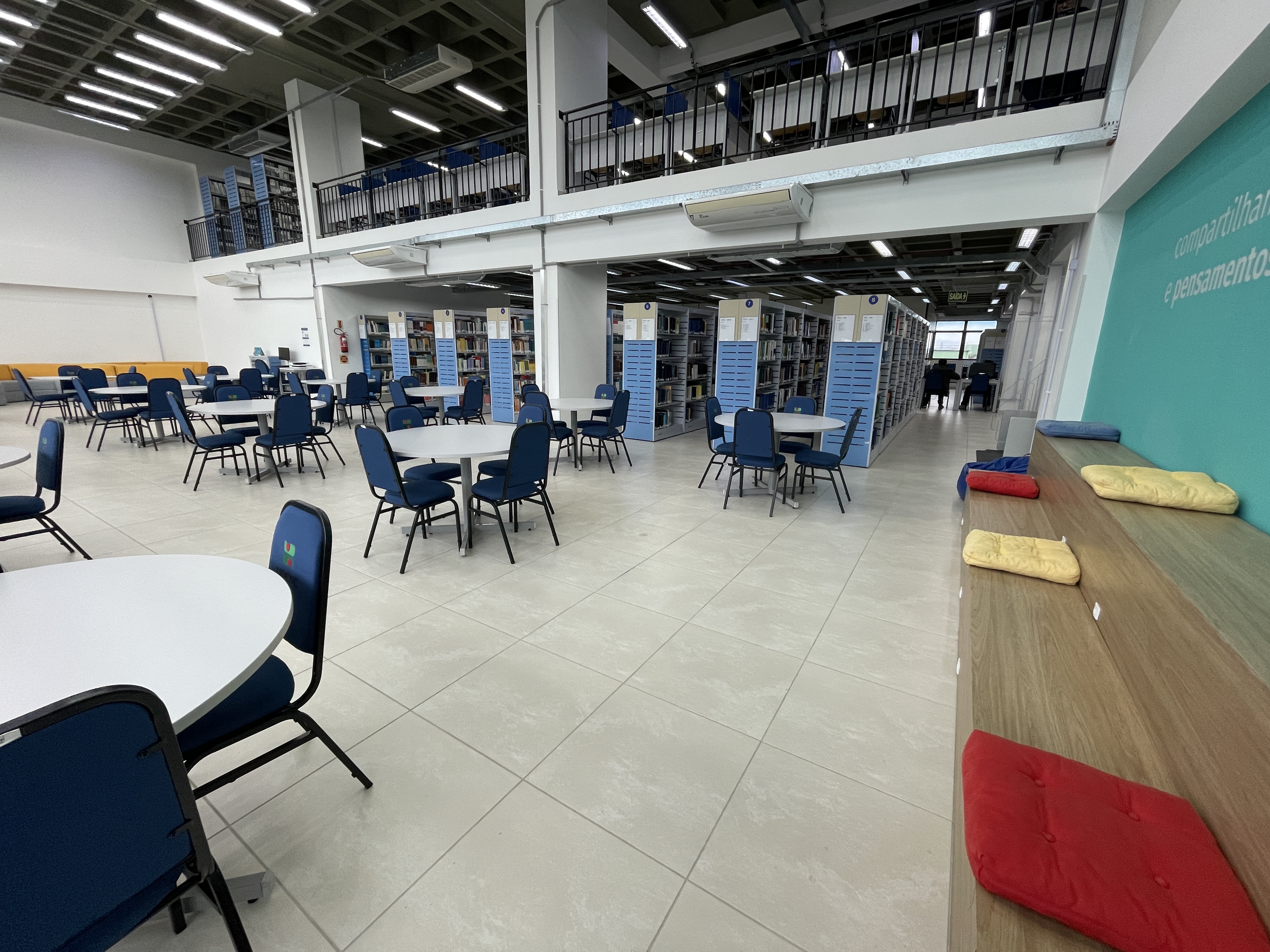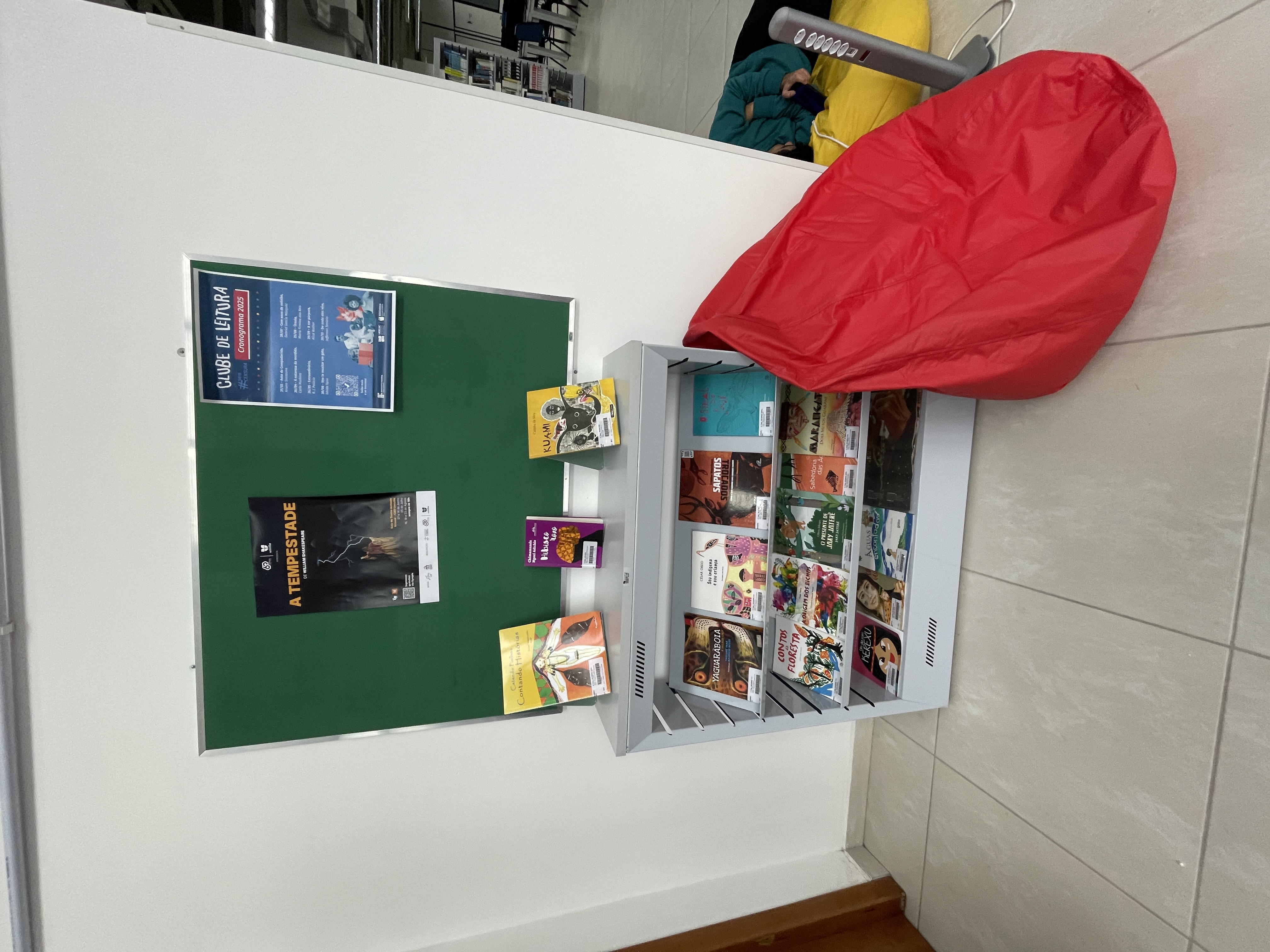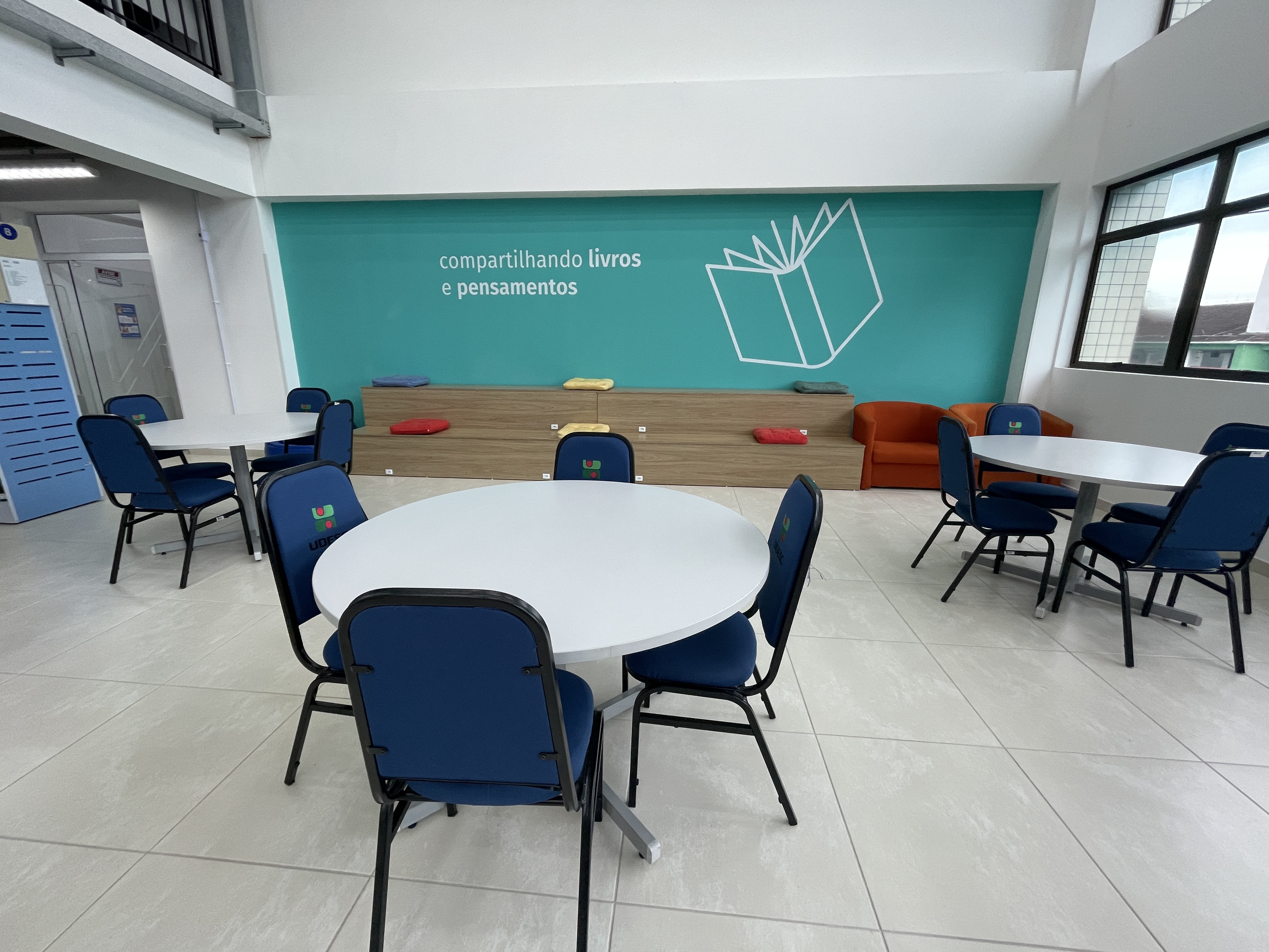 Clube de Leitura - puffs, literatura e mural da Biblioteca Universitária. Espaço aberto para uso da comunidade (9 lugares)