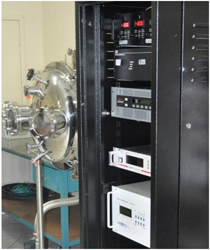 Reator para deposição de filmes, equipado com fontes DC, RF, HiPIMS e DC pulsada; bombas de vácuo mecânica e turbomolecular; sistemas de controle de fluxo de gases e pressão.