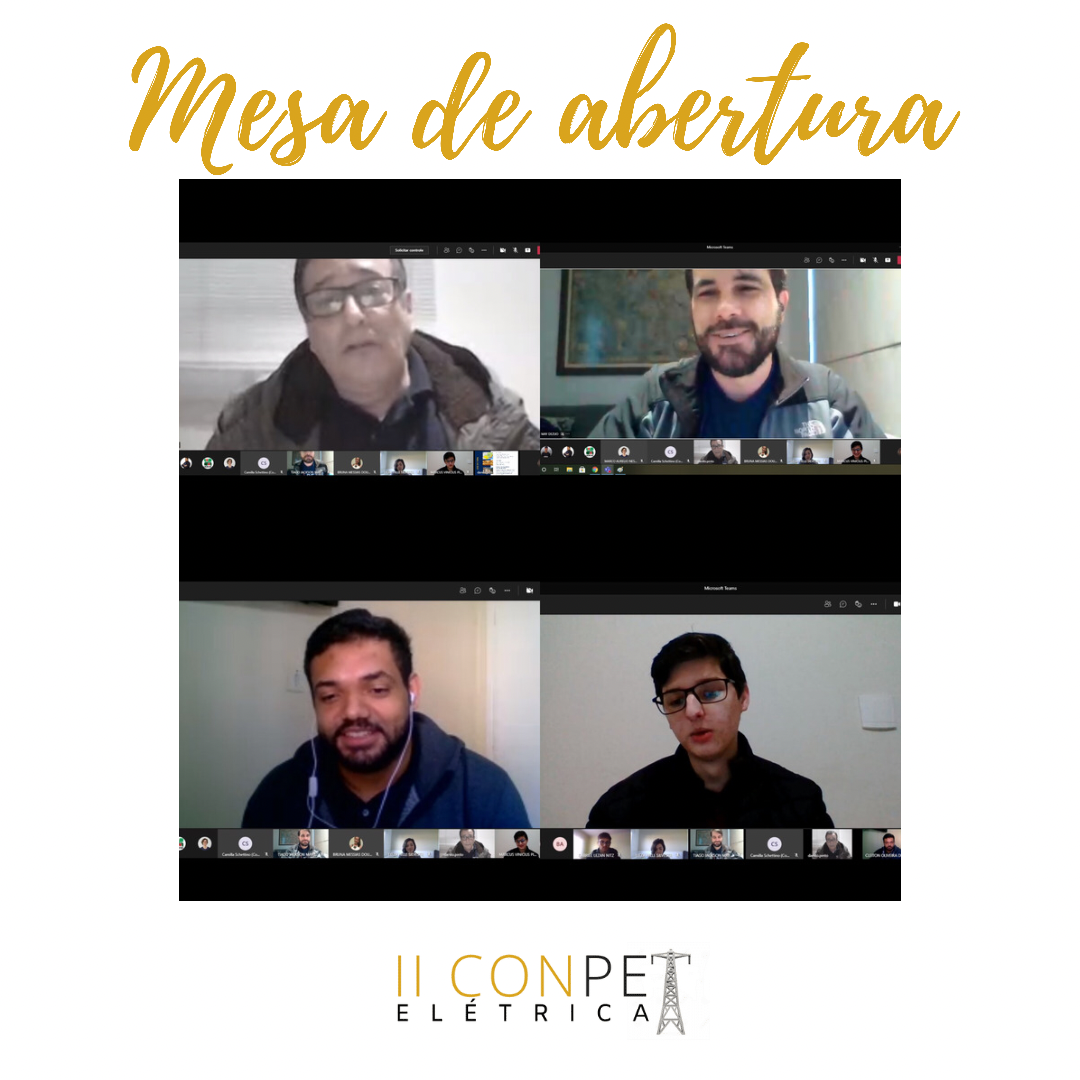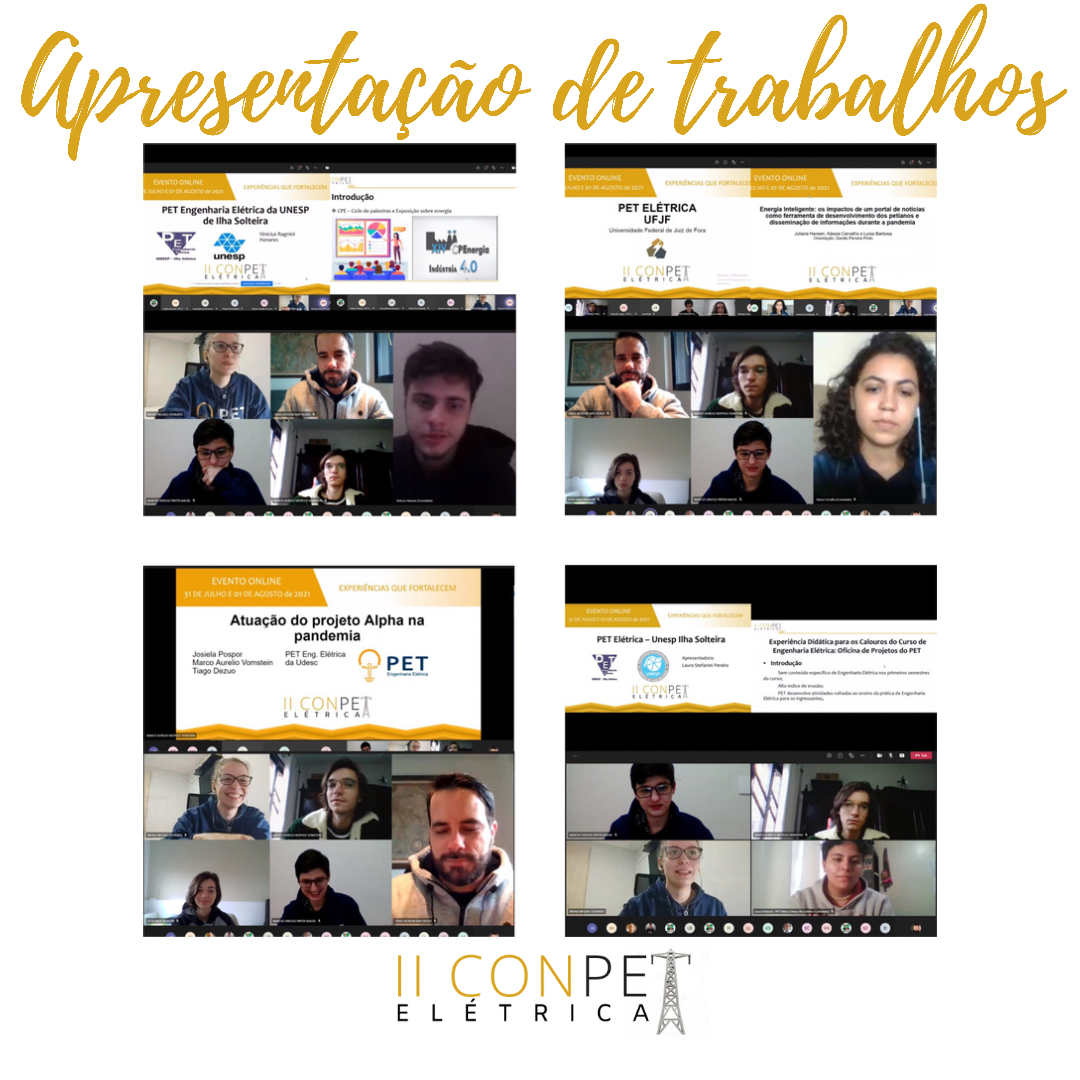 Contando com 97 inscritos de 13 grupos PET Engenharia Elétrica ou áreas afins, o II CONPET Elétrica teve seu início no dia 31/07/2021. Com o tema "Experiências que Fortalecem" o evento contou com espaços de apresentação dos grupos, apresentação de trabalhos, rodas de conversa, mesa de abertura e encerramento.