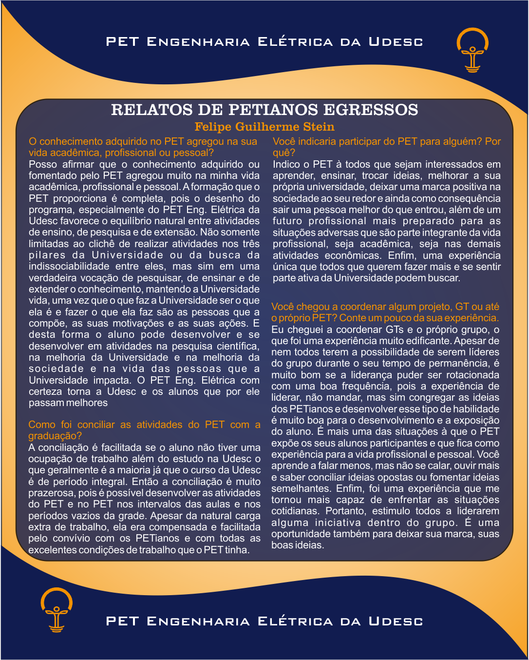 Para obter os relatos aqui existentes, foram questionados egressos que participaram do PET Engenharia Elétrica da Udesc de diferentes épocas.