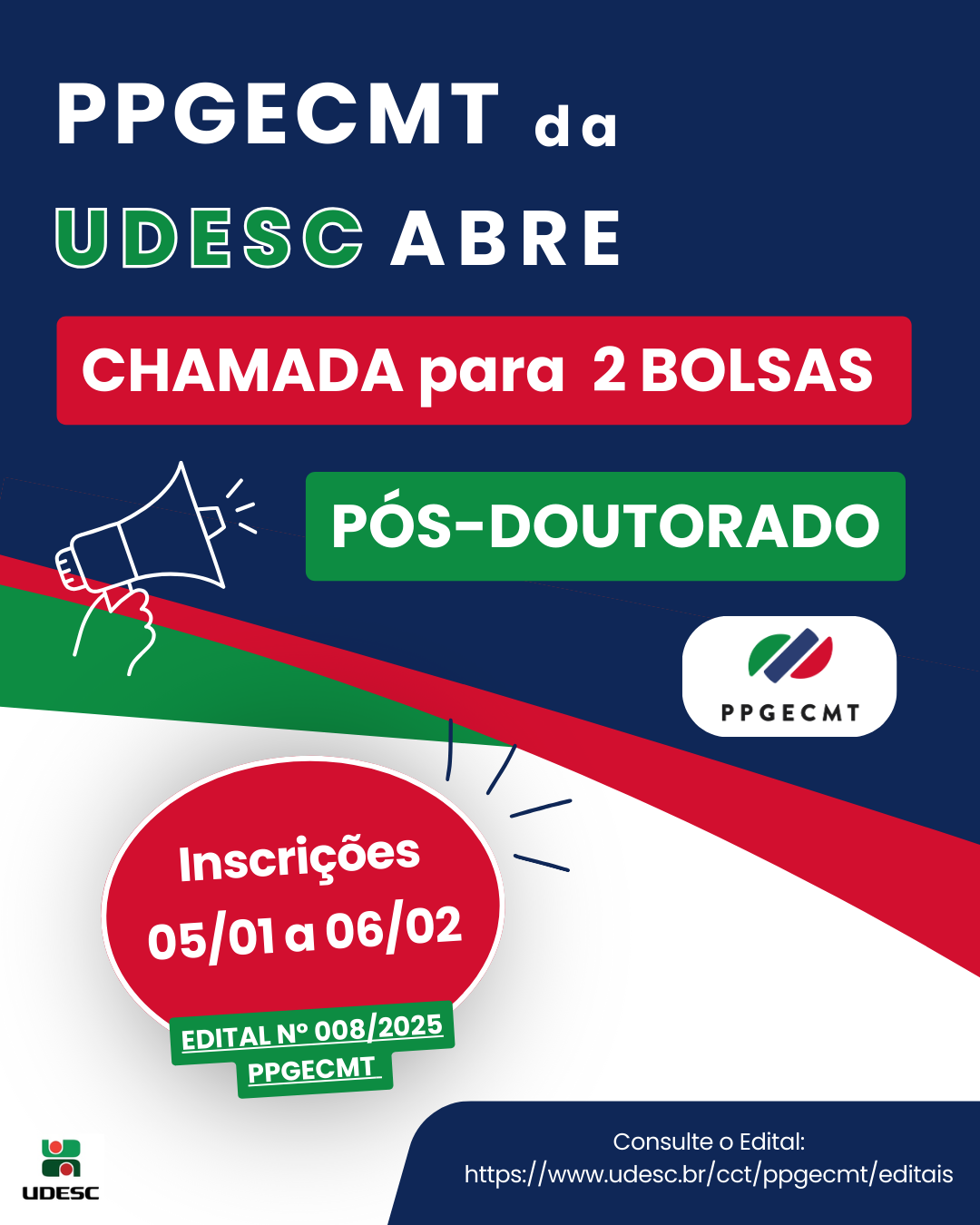 CHAMADA BOLSA PÓS-DOUTORADO - Publicado o edital para duas bolsas de pós-doutorado, Edital PPGECMT nº 008/2025 - Mais informações consulte a página do programa Processo Seletivo para Bolsa de Pós-Doutorado.