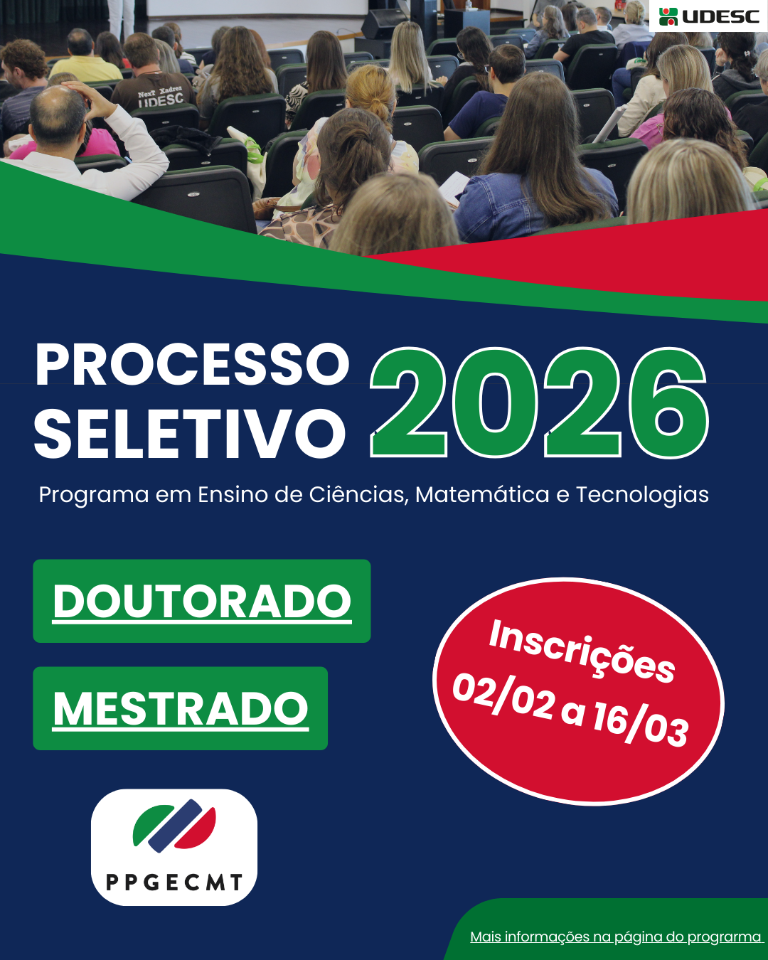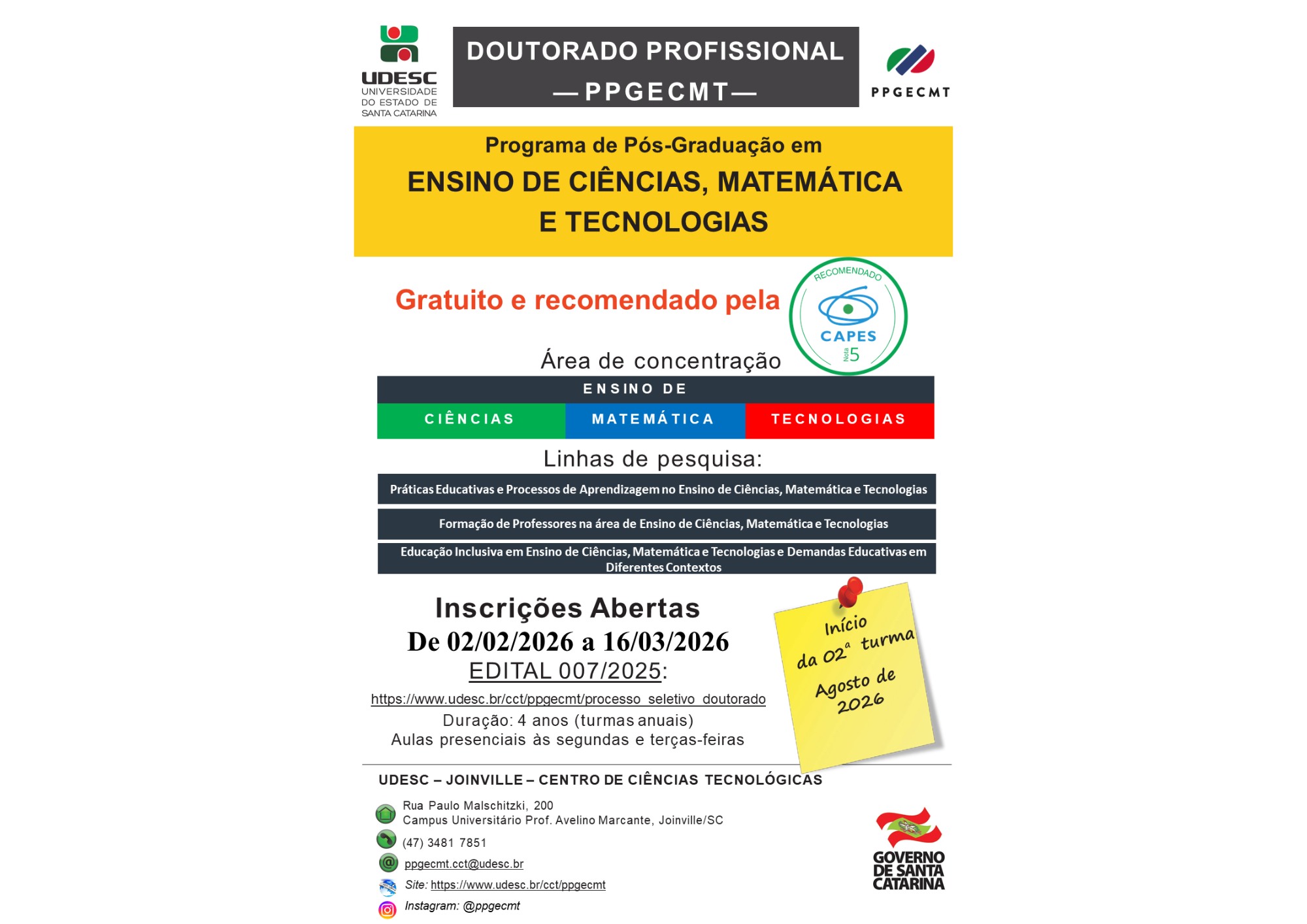 CHAMADA MESTRADO/DOUTORADO 2026 - Publicados os editais de processo seletivo de mestrado e doutorado, Edital PPGECMT nº 006/2025 e Edital PPGECMT nº 007/2025, respectivamente - Abre inscrição, fixa data, horário e critérios para seleção de estudantes do curso de Mestrado/Doutorado Profissional do Programa de Pós-Graduação em Ensino de Ciências, Matemática e Tecnologias do Centro de Ciências Tecnológicas para a Turma 2026. Mais informações consulte a página do programa Processo Seletivo Mestrado / Processo Seletivo Doutorado.