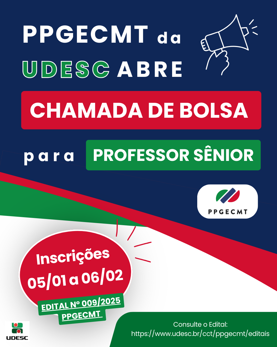 CHAMADA BOLSA PROFESSOR SÊNIOR - Publicado o edital de bolsa para professor Sênior, Edital PPGECMT nº 009/2025 -Mais informações consulte a página do programa Processo Seletivo para Professores Seniores da Pós-Graduação.