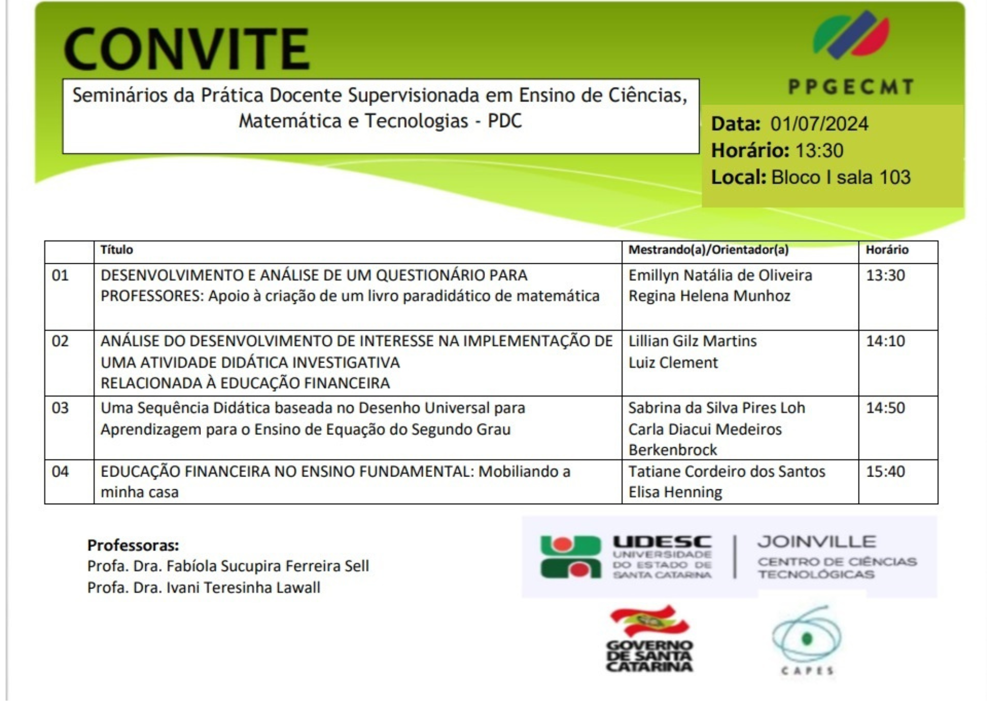 Local: Bloco I Sala 103 - CCT/UDESC