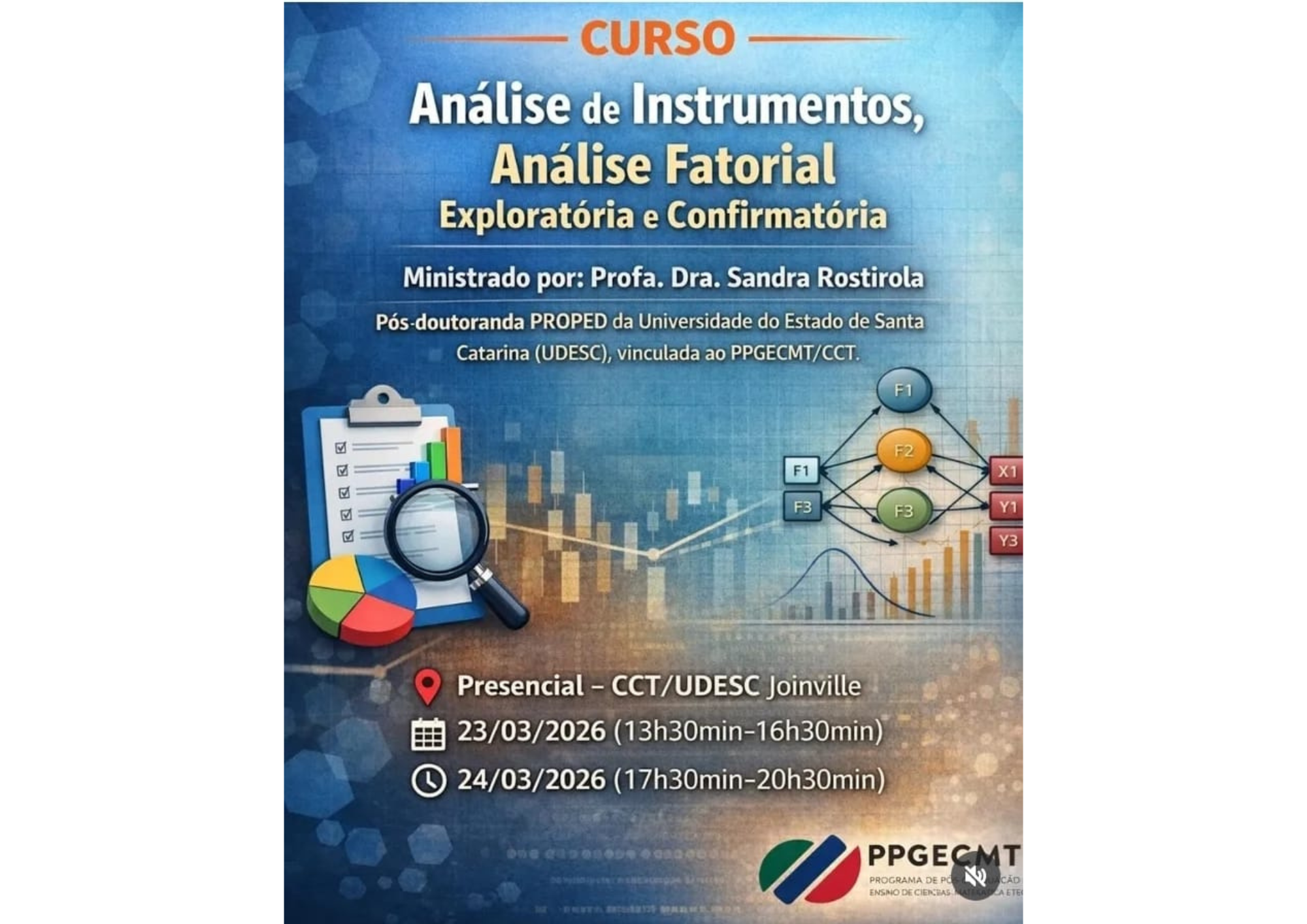 Análise de Instrumentos, Análise Fatorial Exploratória e Confirmatória ministrado por: Profa. Dra. Sandra Rostirola Data: 23/03/2026 - Segunda - 13h30min - 16h30min 24/03/2026 - Terça - 17h30min - 20h30min Local: CCT/UDESC