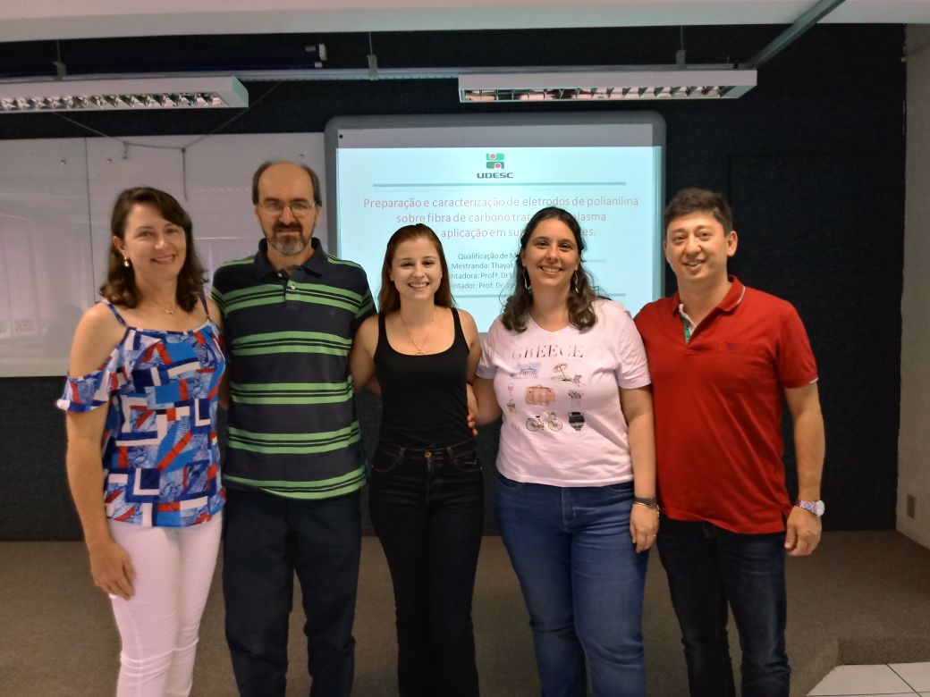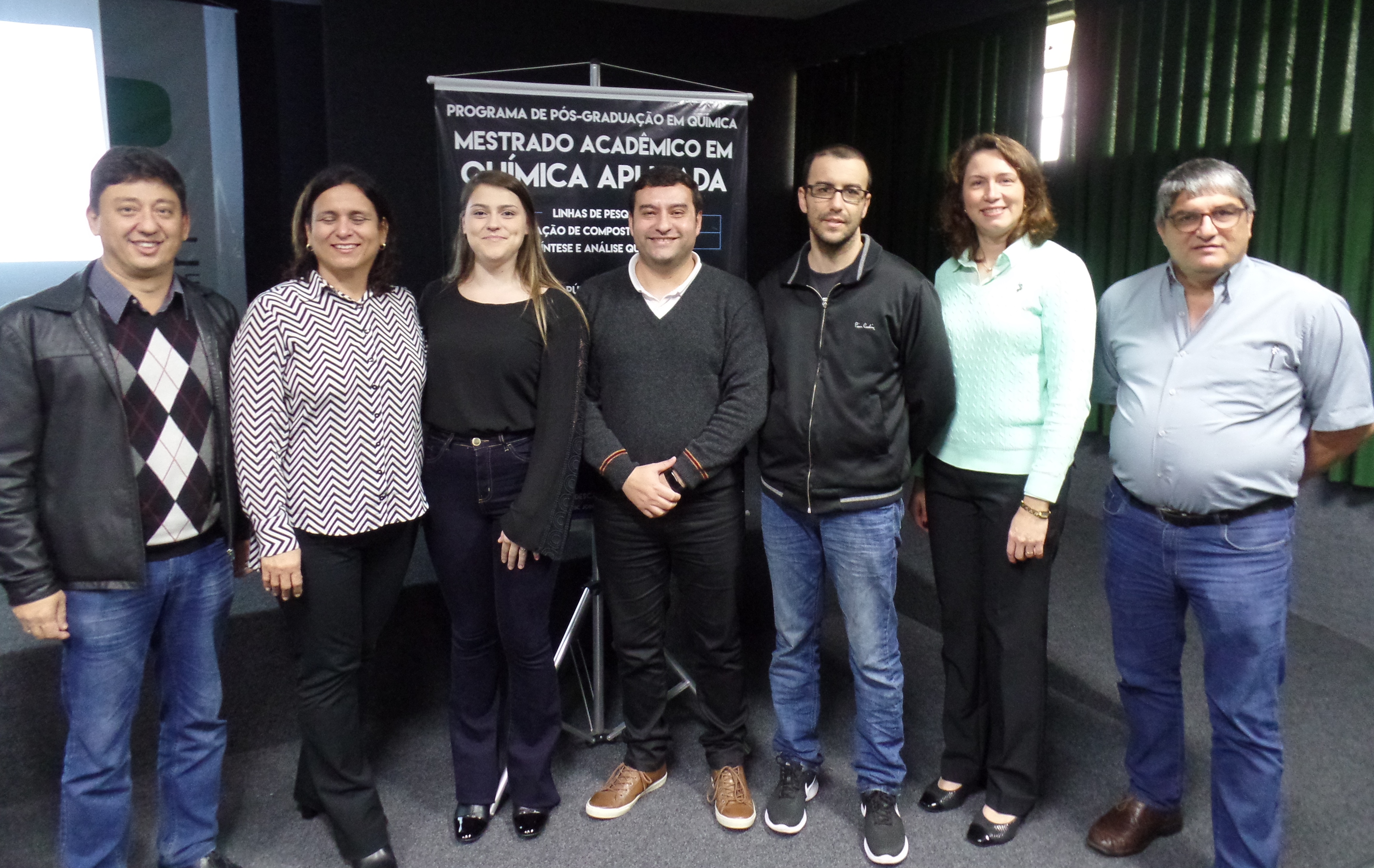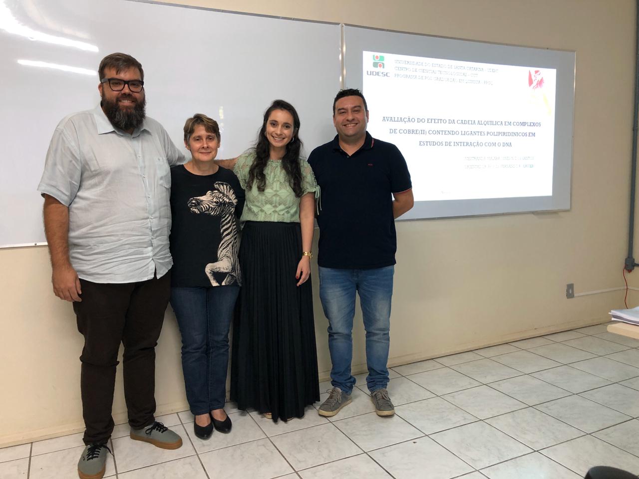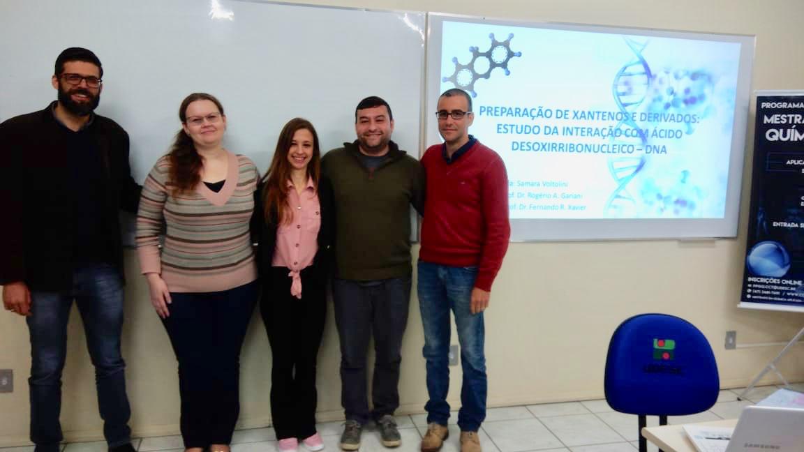04/07/2018 - A mestranda e sua banca com os profs. Sérgio Pezzin (Diretor de Pesquisa), Marcia Meier (Coordenadora do PPGQ) e José Fernando Fragalli (Diretor Geral)