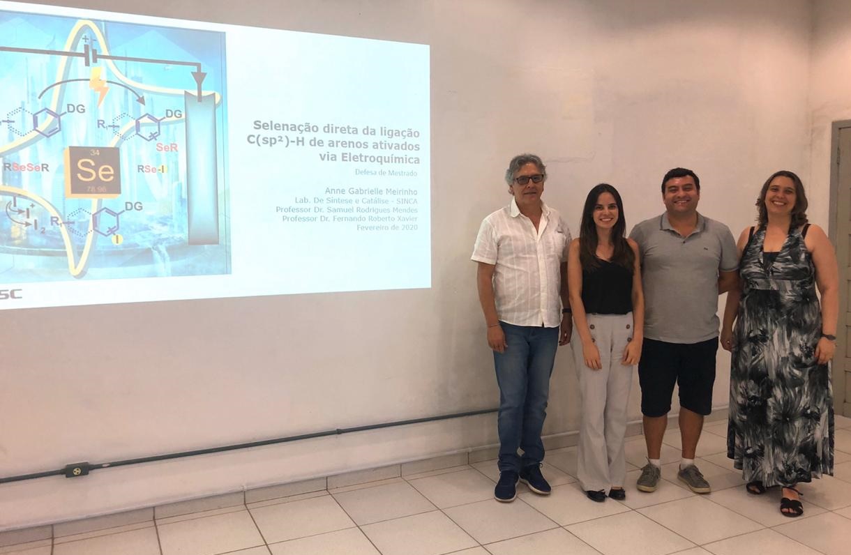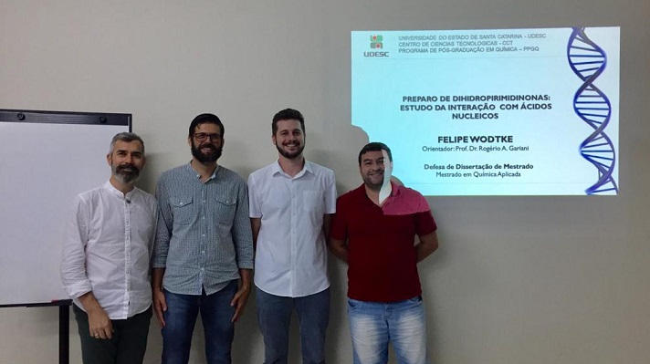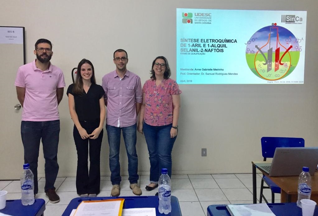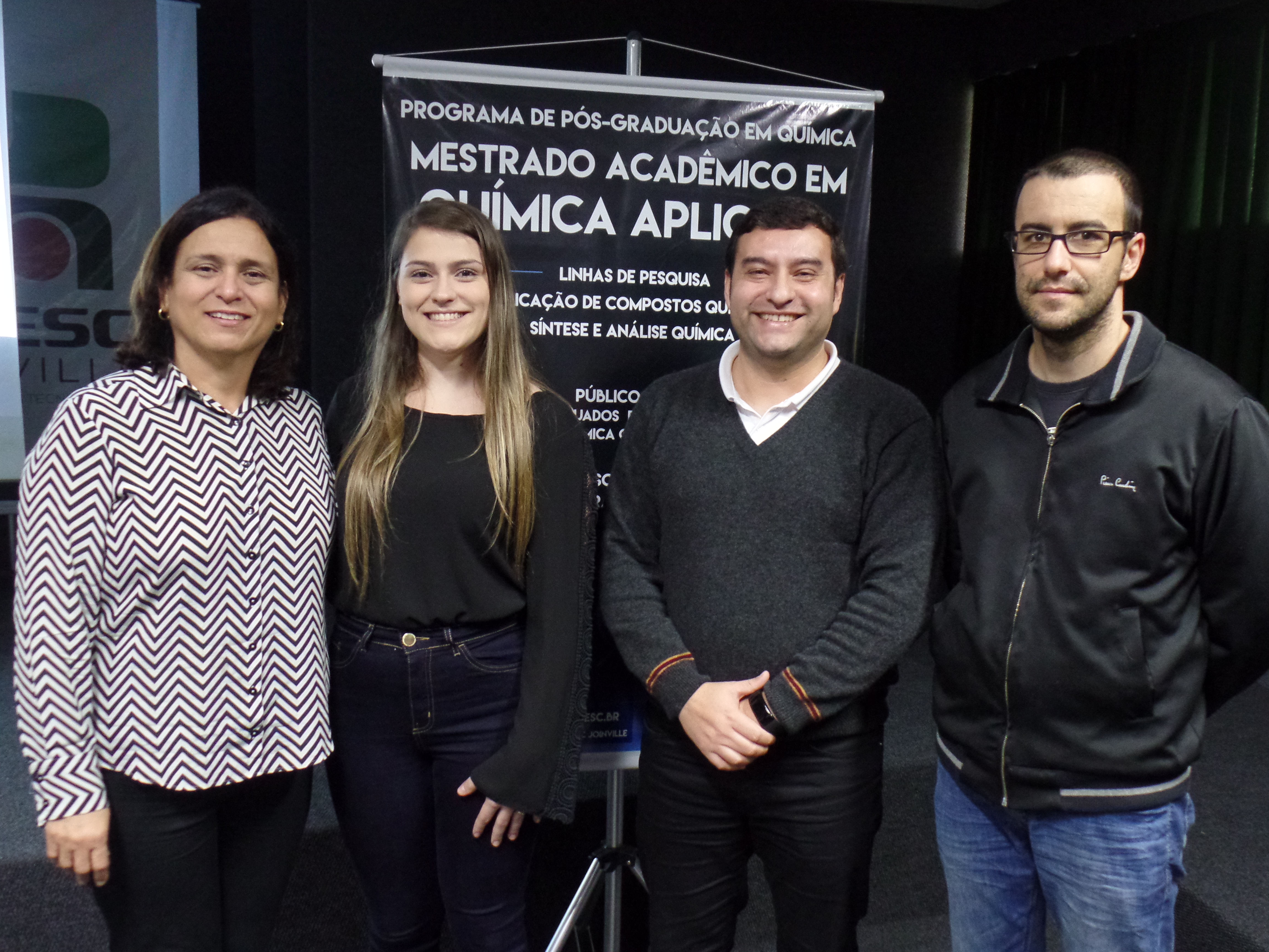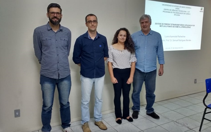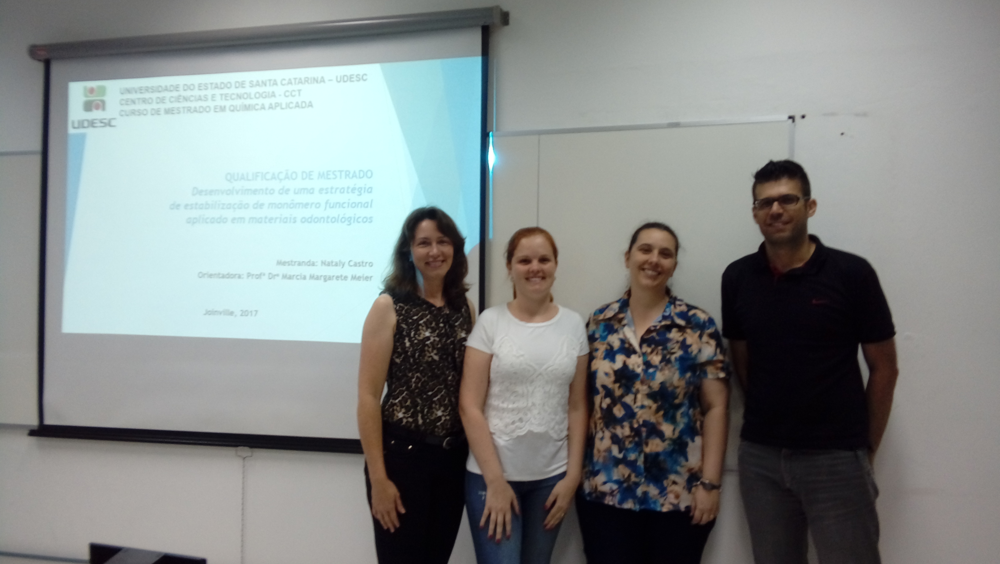 04/07/2018 - A mestranda e sua banca com os profs. Sérgio Pezzin (Diretor de Pesquisa), Marcia Meier (Coordenadora do PPGQ) e José Fernando Fragalli (Diretor Geral)