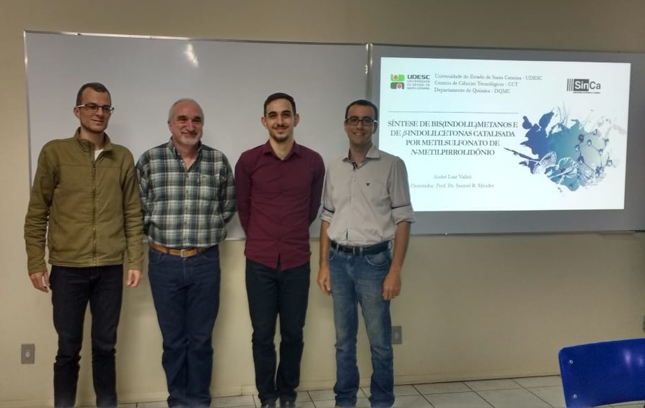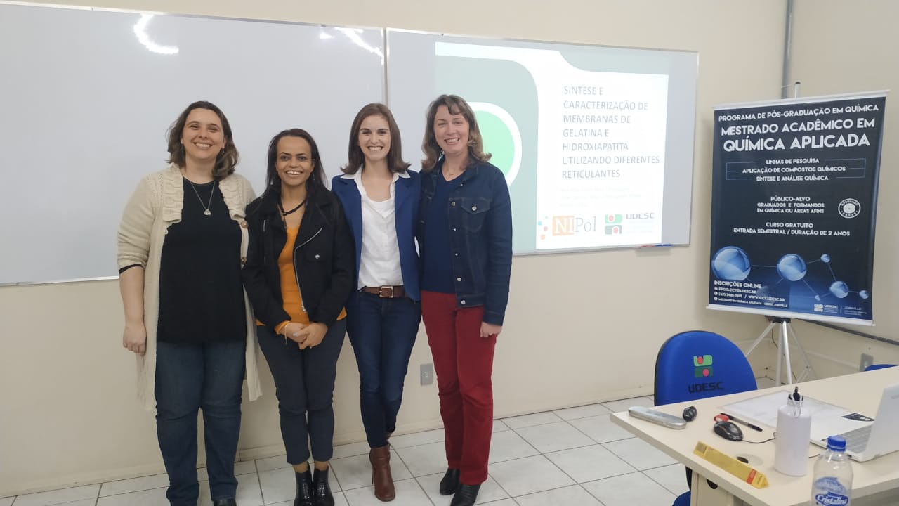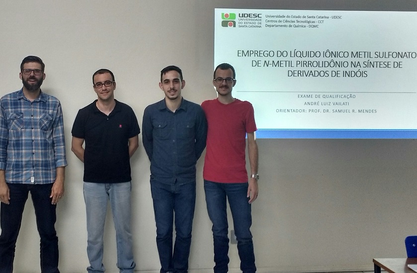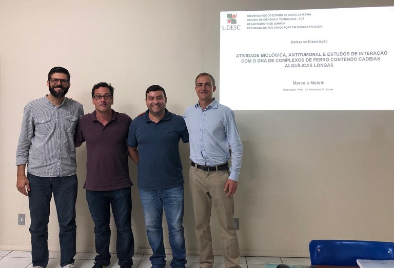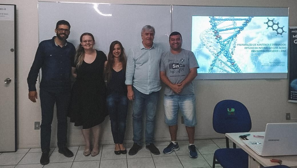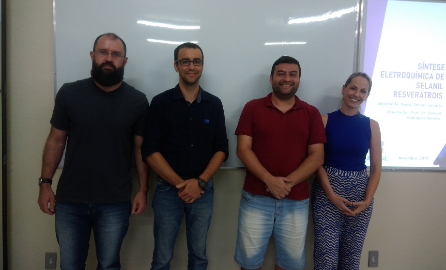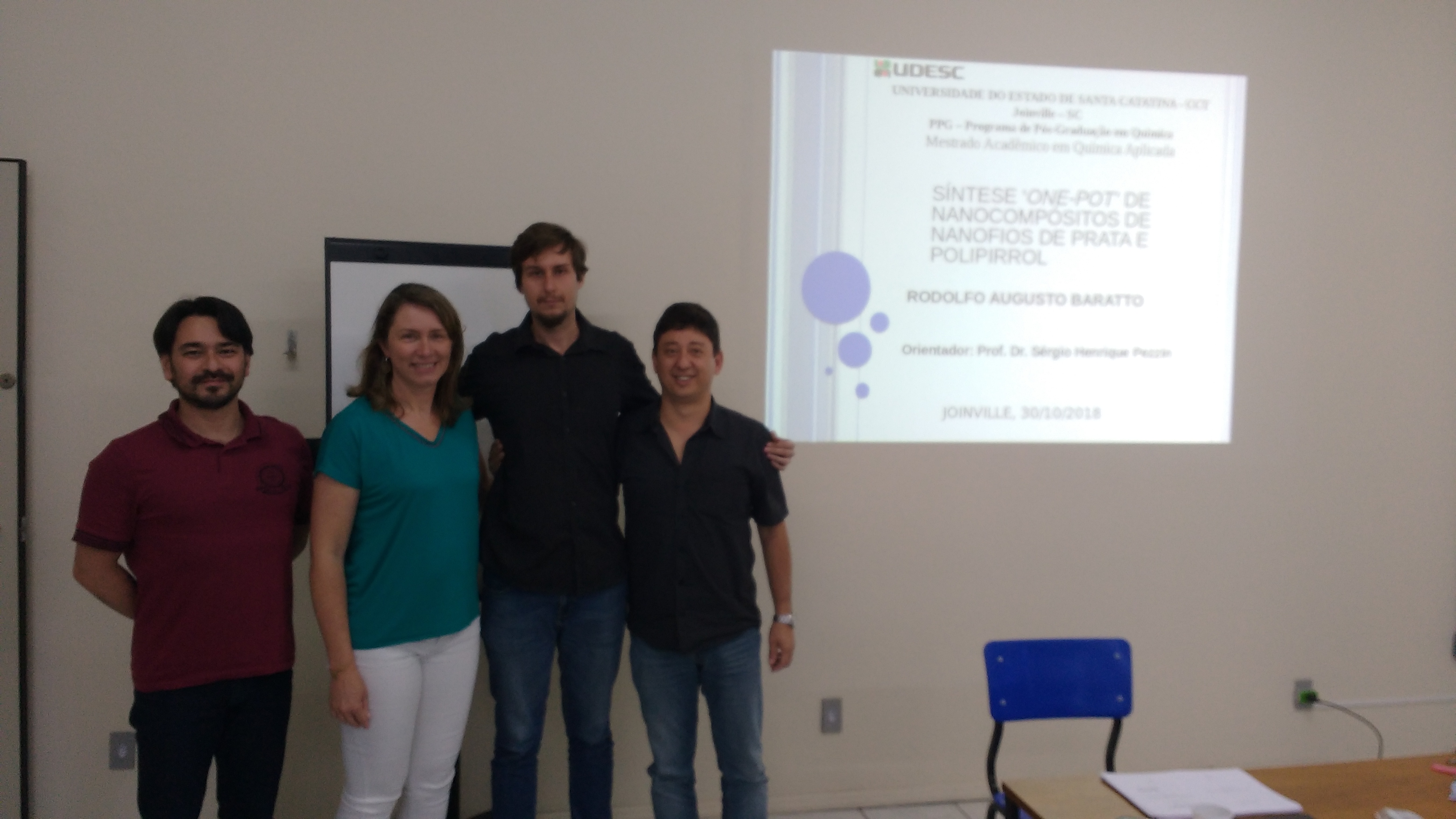04/07/2018 - A mestranda e sua banca com os profs. Sérgio Pezzin (Diretor de Pesquisa), Marcia Meier (Coordenadora do PPGQ) e José Fernando Fragalli (Diretor Geral)