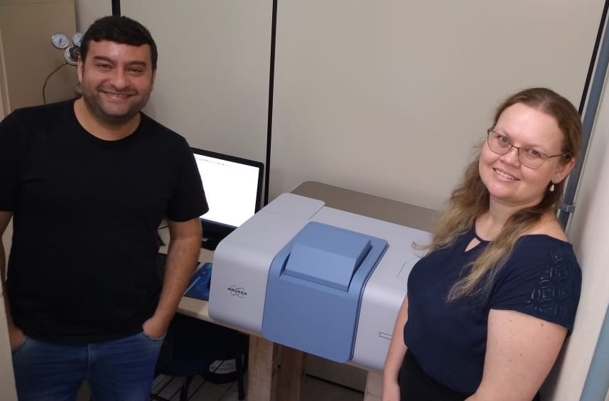 04/12/2019 - Profs. Fernando Xavier e Karine Naidek durante a instalação do Espectrômetro de Infravermelho no LAI - Laboratório de Análise Instrumental