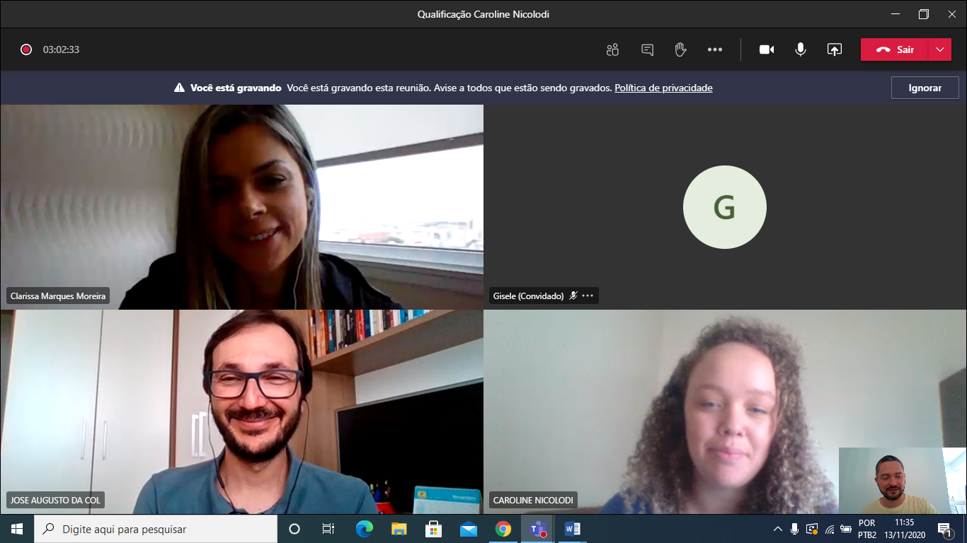 06/11/2020 - Qualificação da aluna Paula Roberta Perondi Furtado (mestranda e membros da banca em sala virtual)