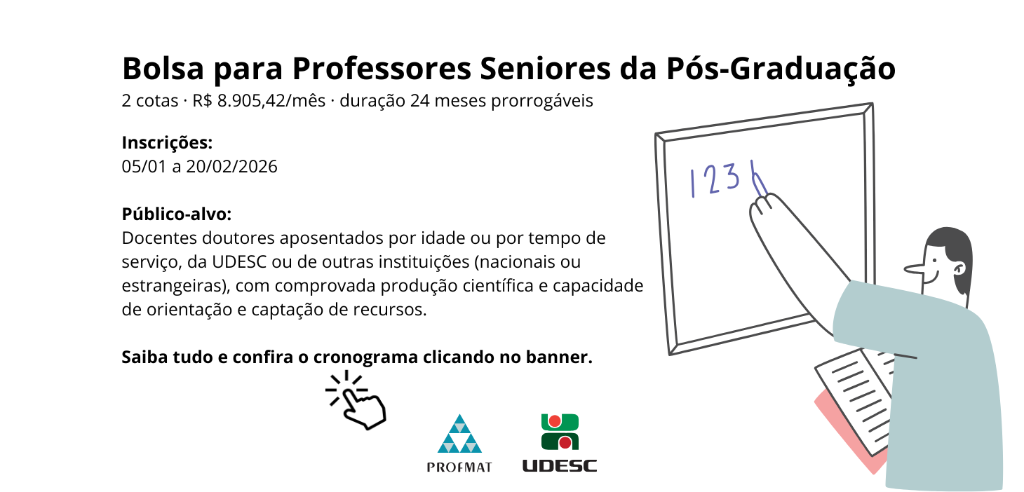 Publicado o Edital sobre o processo seletivo Programa de Bolsas para Professores Seniores da Pós-Graduação (PROBS) do PROFMAT/UDESC.