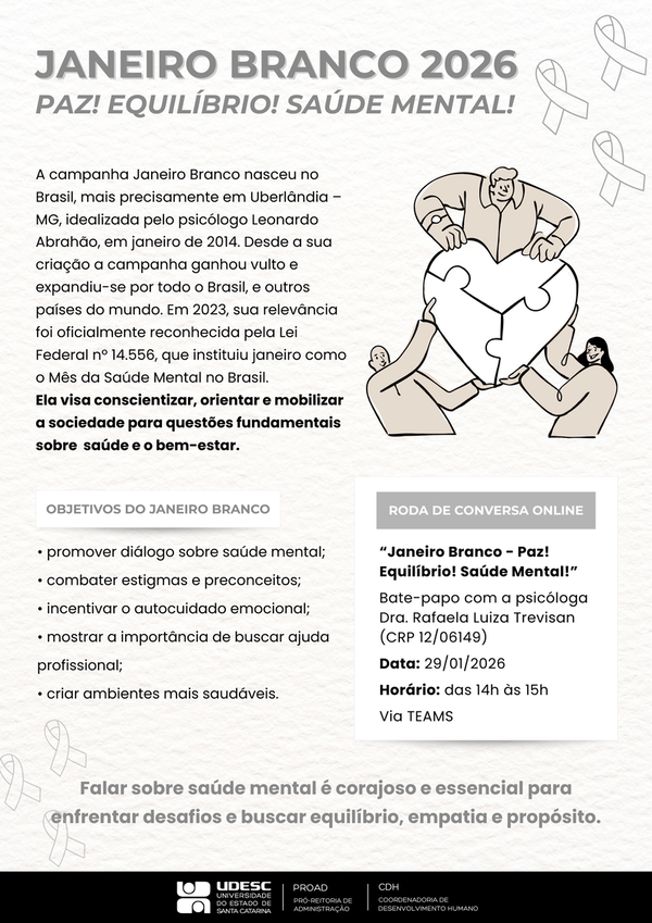 Assim, em alusão à campanha, a CDH irá iniciar suas atividades, com a roda de conversa online, intitulada: “Janeiro Branco - Paz! Equilíbrio! Saúde Mental!". Será um bate-papo com a psicóloga Dra. Rafaela Luiza Trevisan (CRP 12/06149) e você é nosso(a) convidado(a) especial!