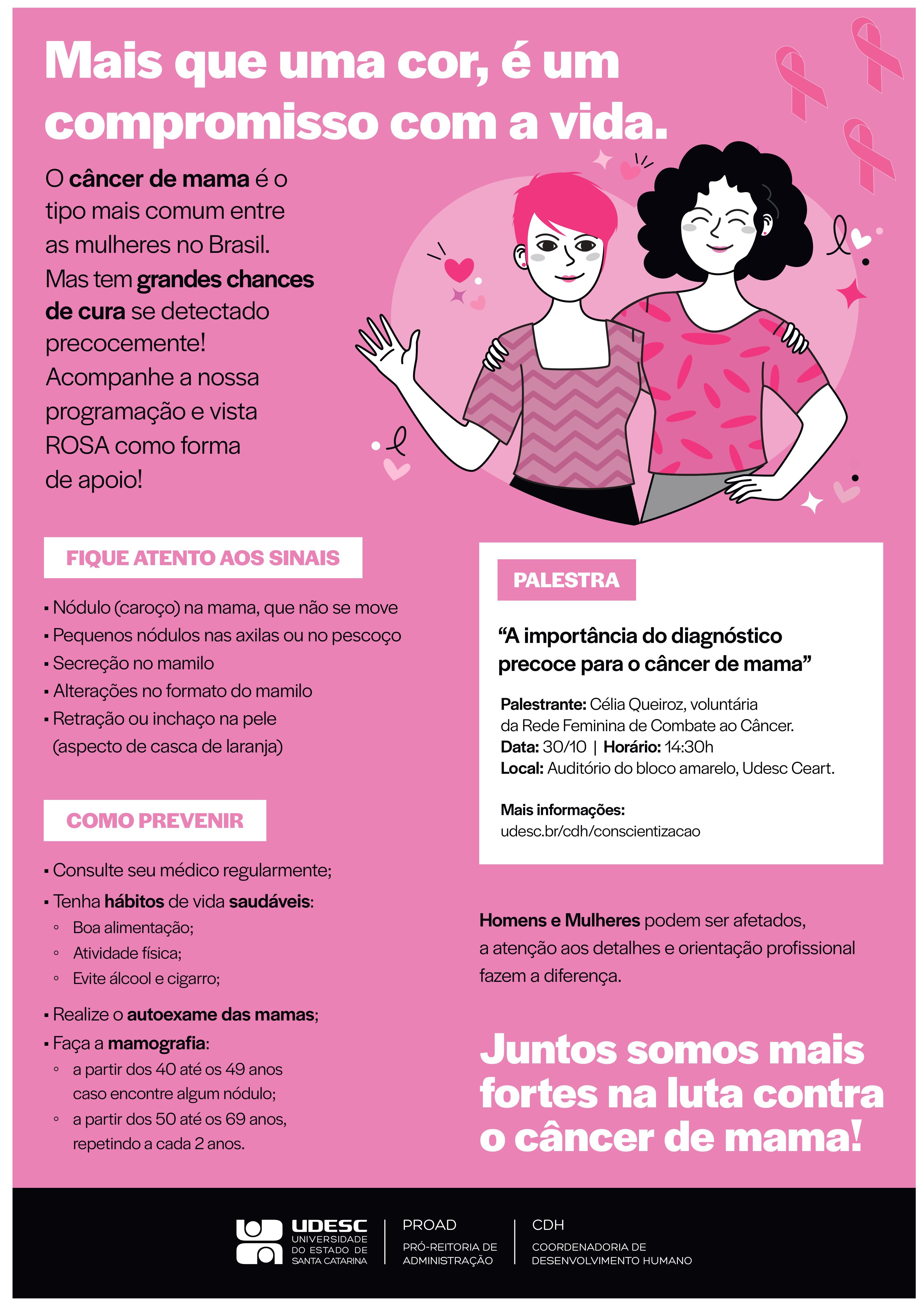 No dia 30 de outubro, às 14h30, no auditório do bloco amarelo (CEART), a UDESC promoverá uma palestra especial sobre a importância do diagnóstico precoce para o câncer de mama, com a participação de Célia Queiroz, voluntária da Rede Feminina de Combate ao Câncer.