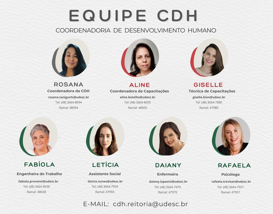 Rosana Taniguchi - Coordenadora de Desenvolvimento Humano E-mail: rosana.taniguchi@udesc.br Telefone: (48) 3664-8094 Ramal: 48094