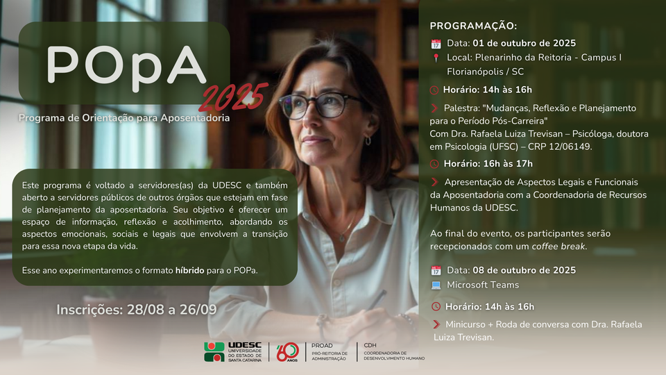 A aposentadoria, em geral, vem junto com diversos conflitos. Muitas vezes, é confundida com o envelhecimento e com a inatividade e isto amedronta as pessoas. Desmistificar esse significado é muito importante para que a pessoa acolha essa nova fase com mais naturalidade. Para tanto, foi implantado em 2017 o Programa de Orientação para Aposentadoria – POpA, que oferece aos servidores públicos em período de aposentadoria e que já adquiriram o direito momentos de reflexão sobre esse novo momento da vida.