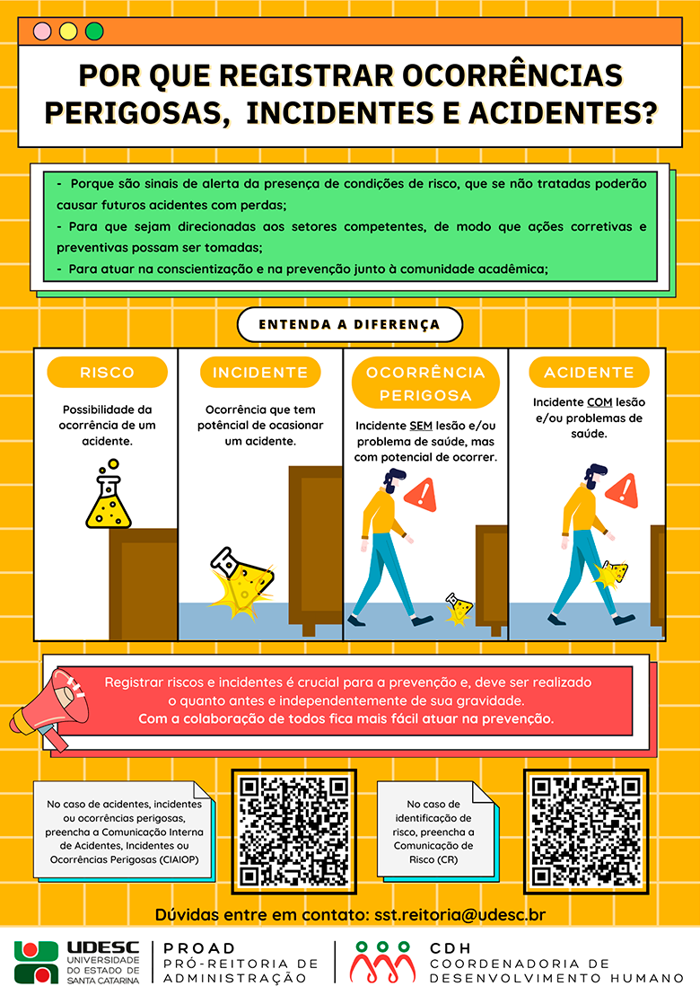 022/2022 - PROAD - Regulamenta a comunicação interna de acidentes incluindo doenças relacionadas ao trabalho, incidentes e /ou ocorrências perigosas, decorrentes no âmbito da Udesc, envolvendo servidores, alunos e/ou terceiros, para fins de notificação, registro, análise, prevenção, cumprimento de legislação trabalhista e previdenciária, e dá outras providências. (Publicada em 08/11/2022).