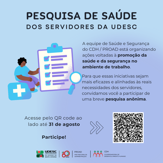Servidor, a equipe de Saúde e Segurança do CDH/PROAD/UDESC está organizando ações para promover mais saúde, segurança e bem-estar no ambiente de trabalho. E para que essas iniciativas estejam realmente alinhadas às necessidades de quem faz a UDESC todos os dias, gostaríamos de contar com a sua colaboração em uma breve pesquisa.