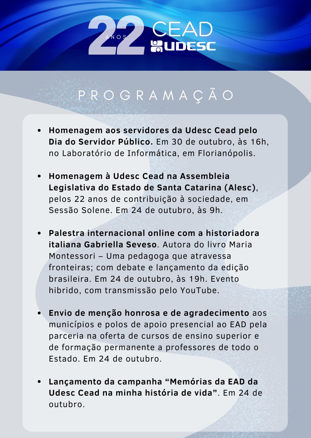 Homenagens na Assembleia Legislativa do Estado de Santa Catarina (Alesc). Em 24 de outubro, às 9h. Homenagem à Udesc Cead pelos 22 anos de serviços prestados à comunidade catarinense, em Sessão Solene da Alesc, com fala da diretora-geral da Udesc Cead, Vera Santos. Proposta pelo deputado Mário Motta.