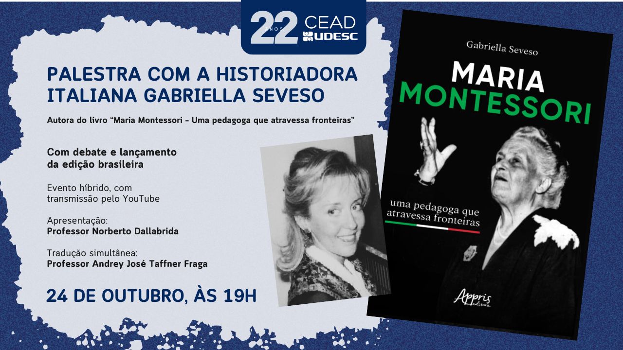 Em 24 de outubro, às 19h, será realizada uma palestra com a historiadora italiana Gabriella Seveso, autora do livro Maria Montessori – Uma pedagoga que atravessa fronteiras; seguida de um debate sobre a obra e do lançamento da edição brasileira.