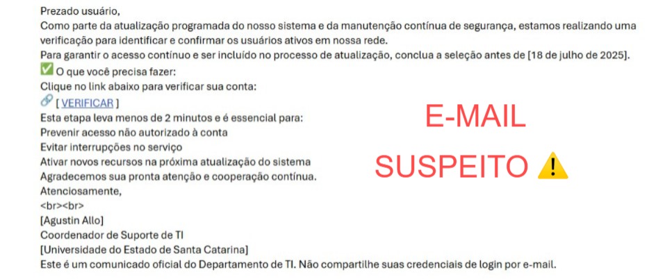 Lembre-se: A UDESC ressalta que NÃO ENVIA ESTE TIPO DE MENSAGEM individualmente aos usuários. Todas as informações institucionais são enviadas por canais oficiais, por meio dos setores de Comunicação, seja por listas de e-mails, notícias nos portais da Udesc ou mídias sociais oficiais.