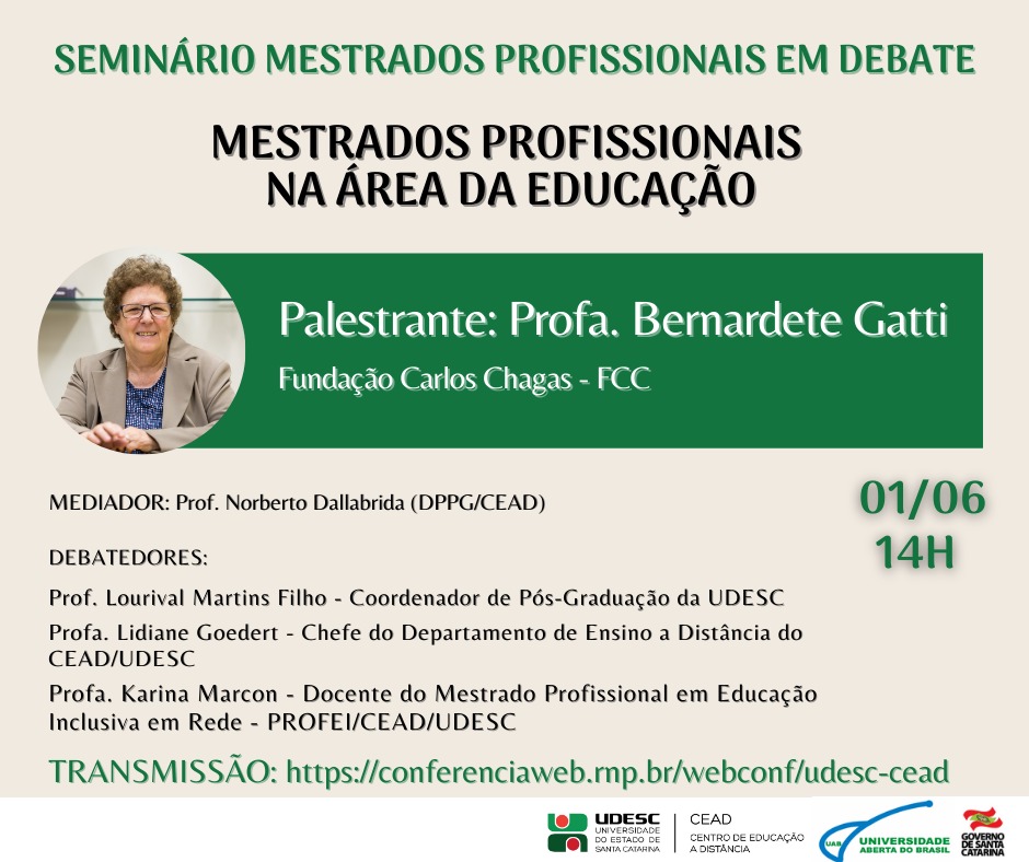 No próximo dia 1º de junho, às 14h, na Universidade do Estado de Santa Catarina (UDESC), por videoconferência, a professora Bernardete Gatti fará uma palestra sobre a formação de professores. Esta conferência integra o “Seminário Mestrados Profissionais em Debate”, promovido pelo Centro de Educação a Distância (CEAD) da UDESC.