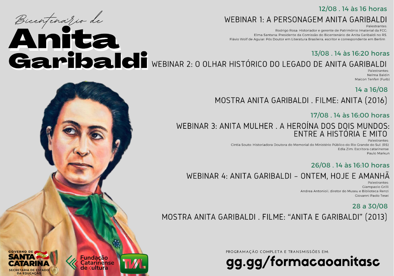 Em gg.gg/formacaoanitasc pode-se acessar a programação da formação docente da SED de Santa Catarina e, de modo especial, as quatro webinares e os filmes da Mostra Anita Garibaldi. Este material disponível online merece ser visto/ouvido neste mês de agosto em que celebramos o bicentenário da “heroína de dois mundos”.