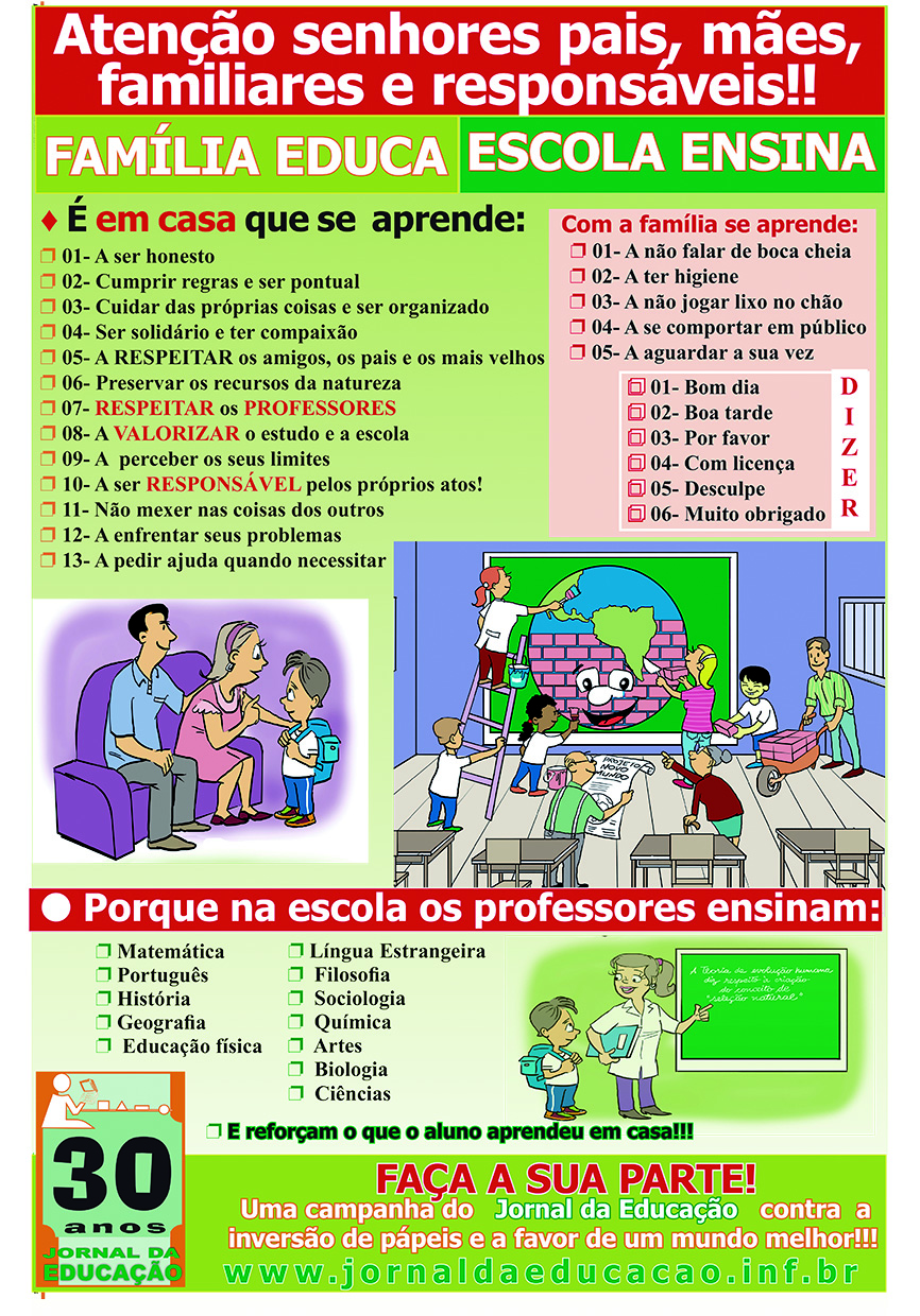 Apesar da expressão ser plenamente aplicável ao Jornal da Educação, no ano em que completa 30 anos de circulação ininterrupta, o jornal de interior mais antigo de Santa Catarina, deflagrou a campanha FAMÍLIA EDUCA - ESCOLA ENSINA.