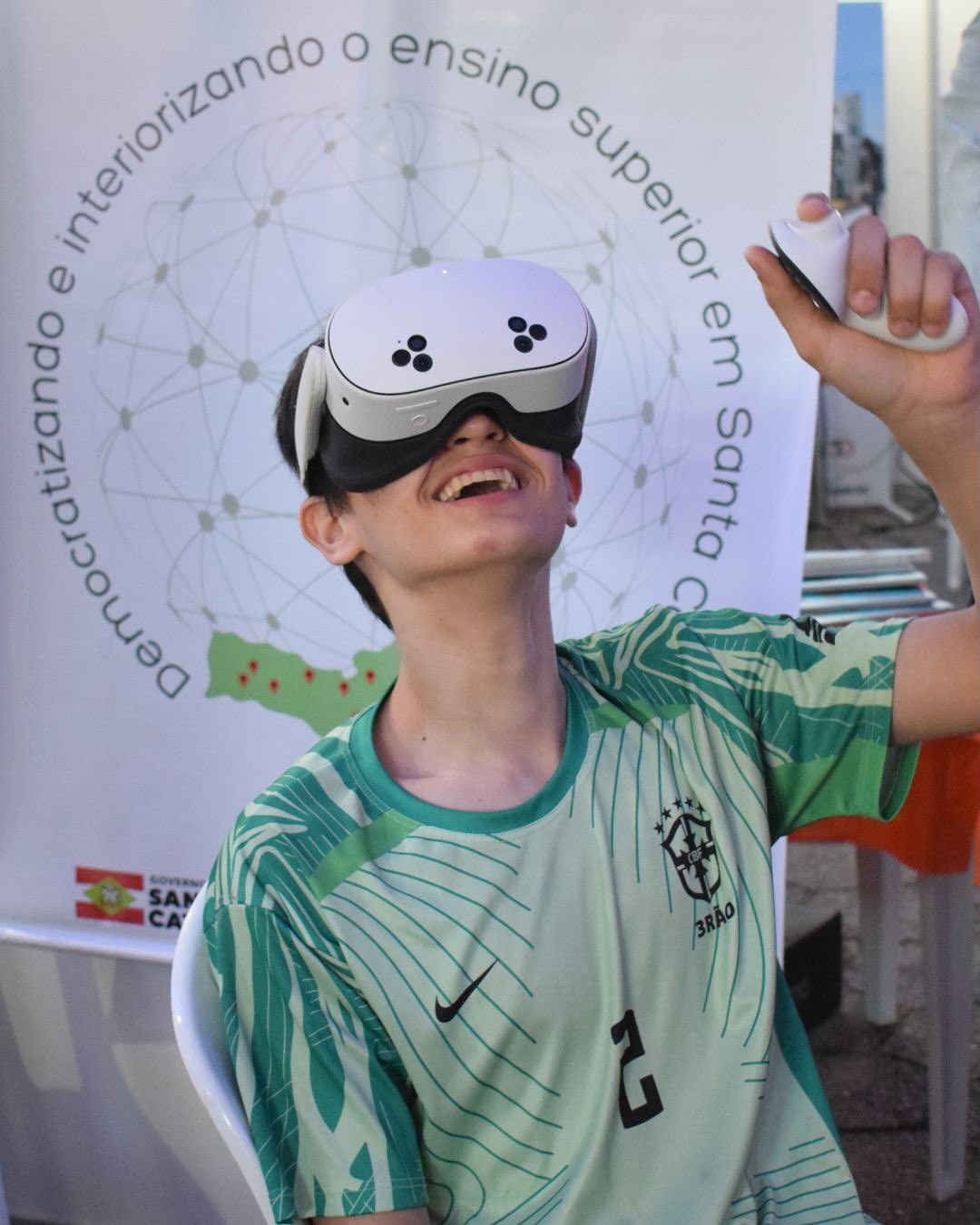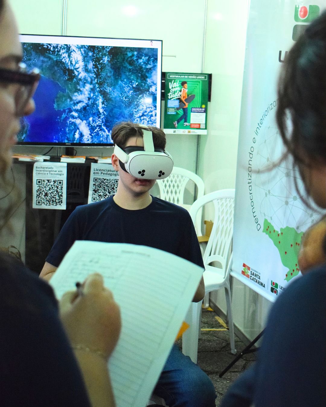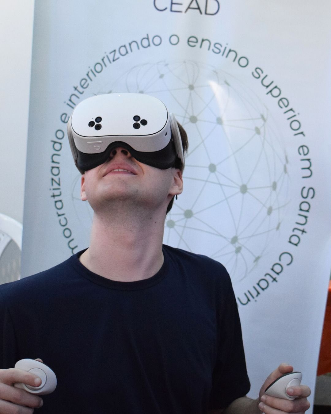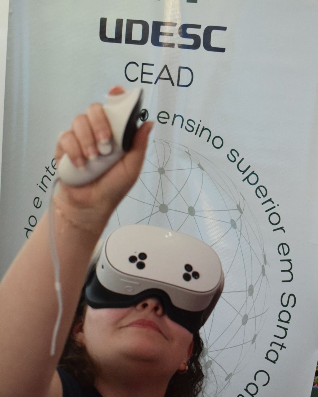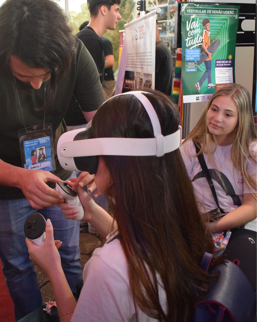 A Udesc Cead marcou presença com um estande no evento do Parque das Profissões em 10 e 11 de setembro, na sede do Campus I, no Bairro Itacorubi, em Florianópolis. A equipe da Udesc Cead destacou os dois cursos de graduação do centro de ensino com vagas pelo Vestibular de Verão 2026: Bacharelado Interdisciplinar em Ciência e Tecnologia (em Florianópolis e Laguna) e Licenciatura em Pedagogia (em Itapema e Laguna). Uma novidade no estande foi o uso de óculos de realidade virtual na recepção aos visitantes, com o objetivo de proporcionar uma experiência inicial com a ferramenta tecnológica aos interessados. Foram usados dois aplicativos: uma simulação de visita à estação espacial e um roteiro guiado pela cidade de Veneza. A iniciativa foi viabilizada com suporte da Coordenadoria de Informática e da Assessoria de Comunicação, sob coordenação da Direção de Ensino de Graduação.