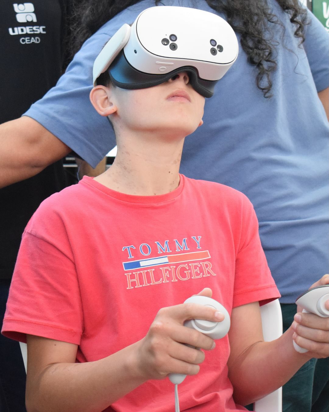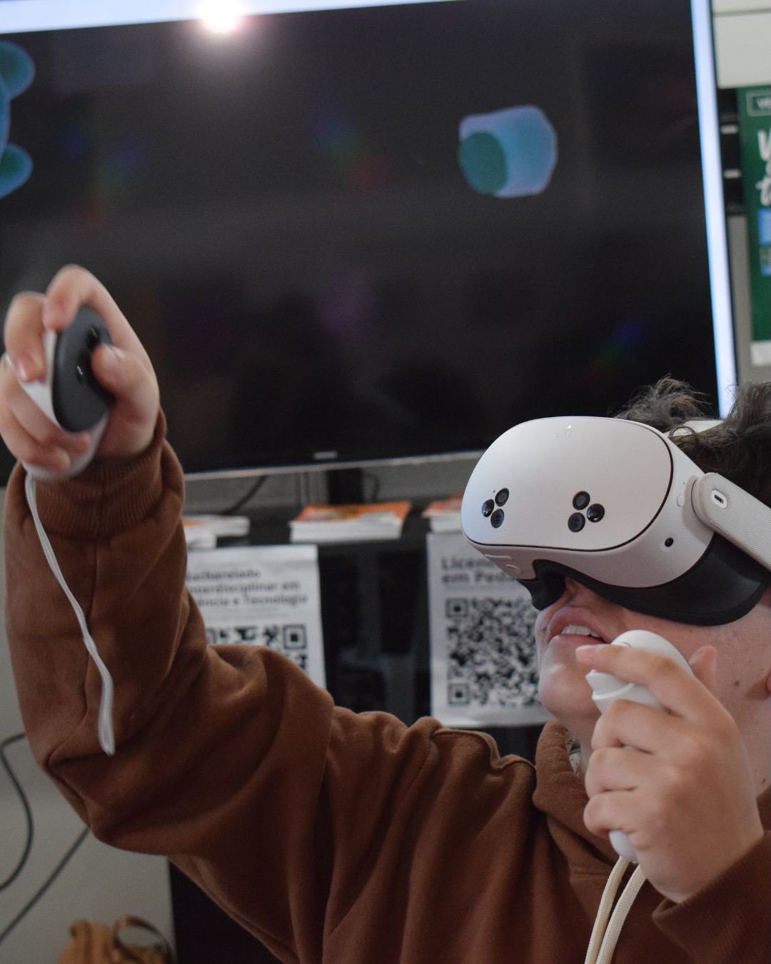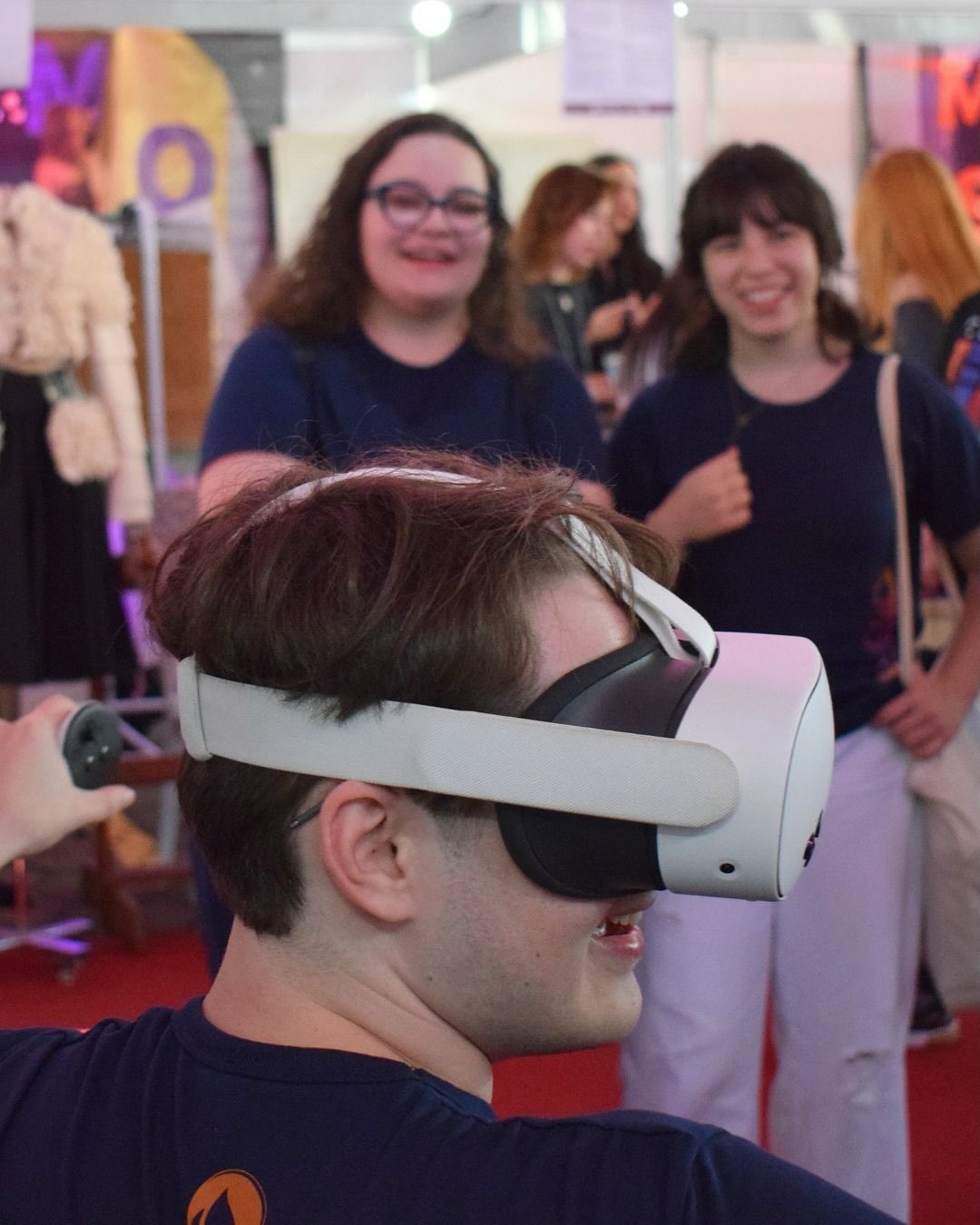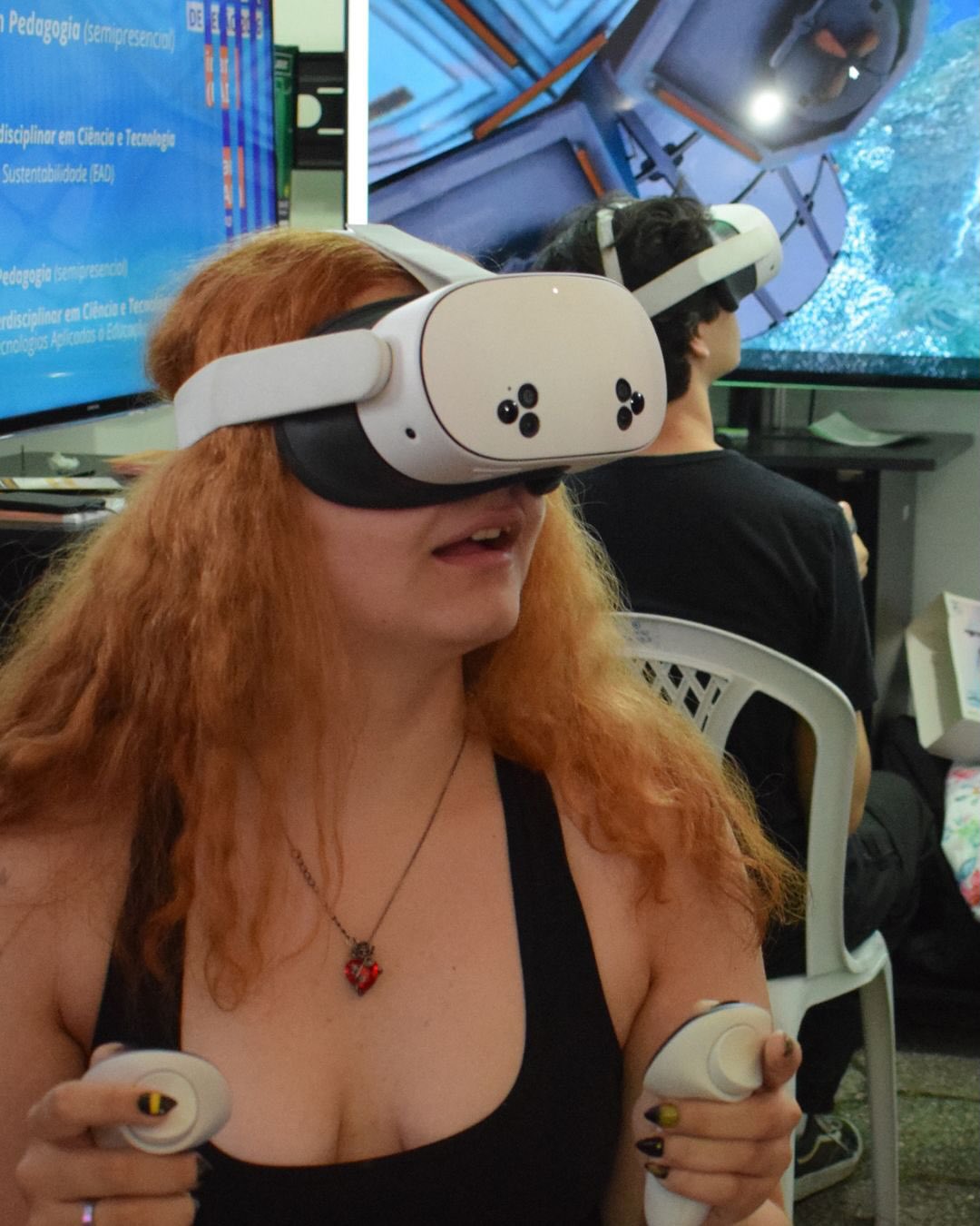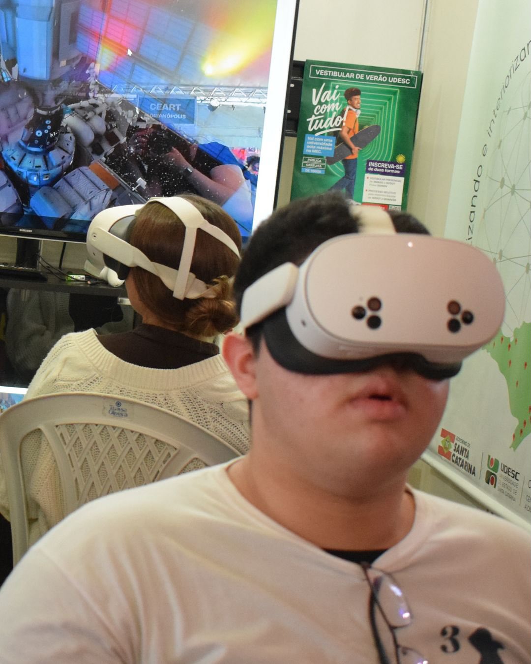 A Udesc Cead marcou presença com um estande no evento do Parque das Profissões em 10 e 11 de setembro, na sede do Campus I, no Bairro Itacorubi, em Florianópolis. A equipe da Udesc Cead destacou os dois cursos de graduação do centro de ensino com vagas pelo Vestibular de Verão 2026: Bacharelado Interdisciplinar em Ciência e Tecnologia (em Florianópolis e Laguna) e Licenciatura em Pedagogia (em Itapema e Laguna). Uma novidade no estande foi o uso de óculos de realidade virtual na recepção aos visitantes, com o objetivo de proporcionar uma experiência inicial com a ferramenta tecnológica aos interessados. Foram usados dois aplicativos: uma simulação de visita à estação espacial e um roteiro guiado pela cidade de Veneza. A iniciativa foi viabilizada com suporte da Coordenadoria de Informática e da Assessoria de Comunicação, sob coordenação da Direção de Ensino de Graduação.