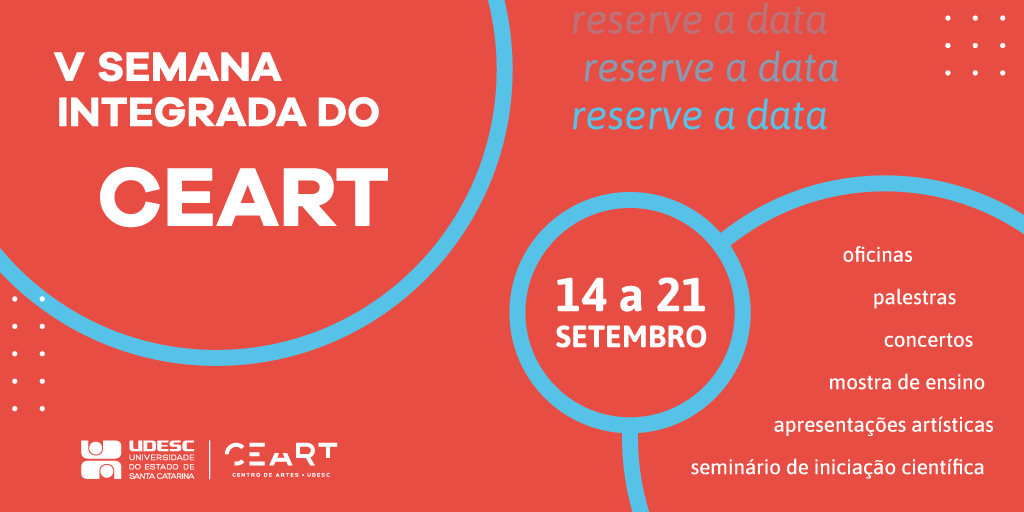 O Centro de Artes (Ceart) da Universidade do Estado de Santa Catarina (Udesc) realiza de 14 a 20 de setembro de 2019, em Florianópolis, a 5ª Semana Integrada do Ceart. O evento levará arte e cultura para diversos locais de Florianópolis – Udesc Ceart, Museu Histórico de Santa Catarina, Teatro Álvaro de Carvalho, entre outros. A programação é gratuita e aberta ao público.