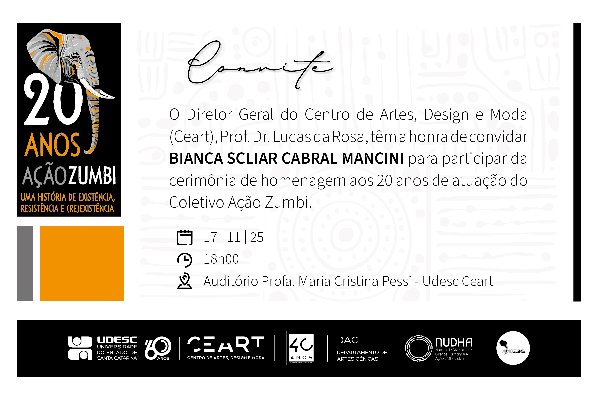 O Coletivo Ação Zumbi, fundado em novembro de 2003 pelas artistas Lelette Coutto, Marga Vieira e Fernanda Rosa, é o grupo de teatro negro mais antigo de Santa Catarina e um marco fundamental na história das artes cênicas da nossa região. Ao longo de mais de duas décadas, o coletivo tem desenvolvido projetos nas áreas de teatro, cinema, dança e vídeo, incluindo montagens de espetáculos, oficinas e organização de eventos com especial enfoque na cultura negra. Entre seus membros que passaram pelo CEART-UDESC, destacam-se Adriano de Brito, professor de educação física e ator, Giselle Correa, pedagoga e atriz, e Fabrícia Brito, pedagoga e atriz, que desenvolveram importantes trabalhos junto ao coletivo. O grupo realizou leituras dramáticas e apresentações no CEART UDESC, estabelecendo conexões significativas para a formação de nossas estudantes.