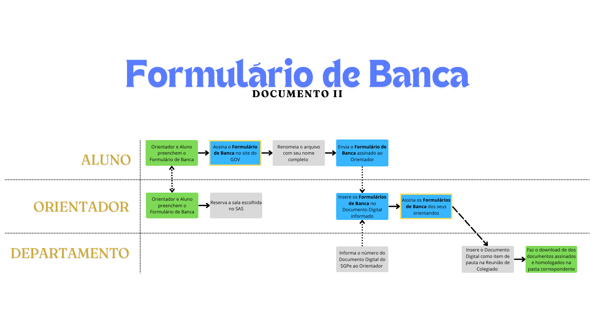 Passo a passo:clique aqui Enviar para:seu orientador. Prazo (banca no 1º semestre): 31 maio de cada ano (sujeito a alterações). Prazo (banca no 2º semestre): 31 de outubro de cada ano (sujeito a alterações). Observações: O orientador deverá inserir no SGPe o Formulário preenchido e assinado em PDF (comum, sem senha) O número do processo digital será informado pelo DDE. Modelo:Formulário de banca de TCC Assinaturas no documento: primeiro o aluno poderá usar o site do governo, acessando: ASSINATURA ELETRÔNICA e em seguida o professor assina pelo SGPe.