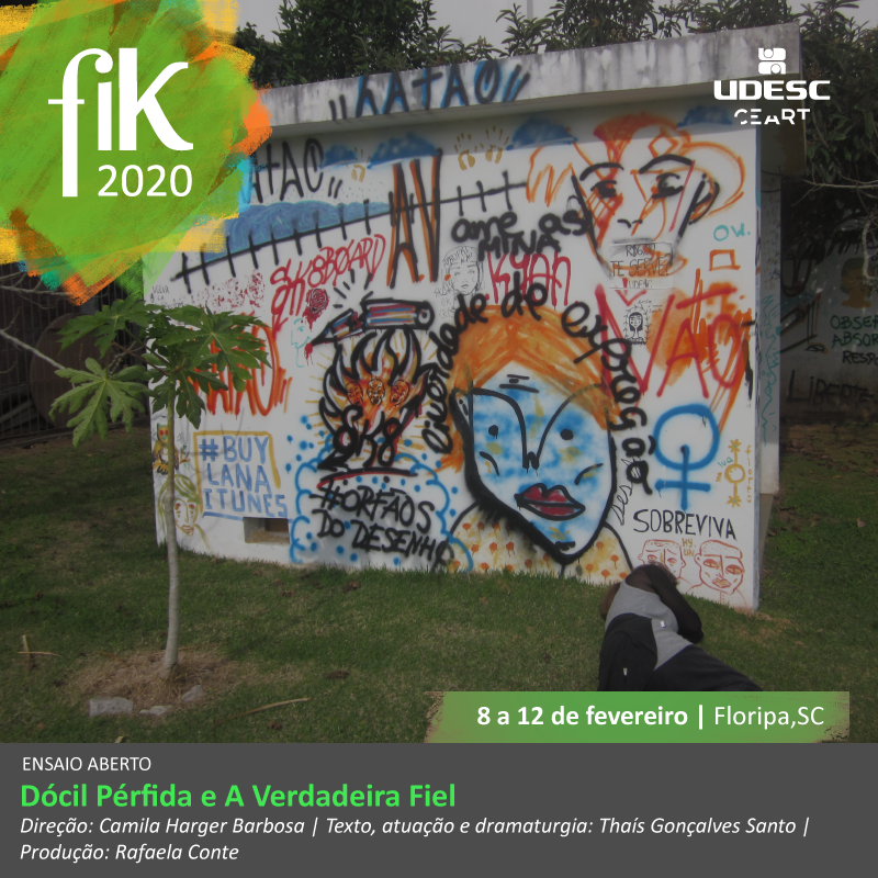 Sinopse: Dócil Pérfida e A Verdadeira Fiel emerge a partir de um processo dramatúrgico e feminista dos lugares dados e mantidos nas visualidades e escutas sociais. Mapeamentos poéticos do lugar de fala da própria artista. Sob Direção de Camila Harger Barbosa, os Dois opostos perfis de uma mesma mulher, quase nunca sendo totalmente verdadeiros em suas utopias. A proposta de ensaio aberto brota, neste contexto, para diálogo com e fruição artística dos espectadores, bem como a prática Teatral em formação da aprendiz de atriz e autora, da diretora e produtora. Um trabalho feito por mulheres.