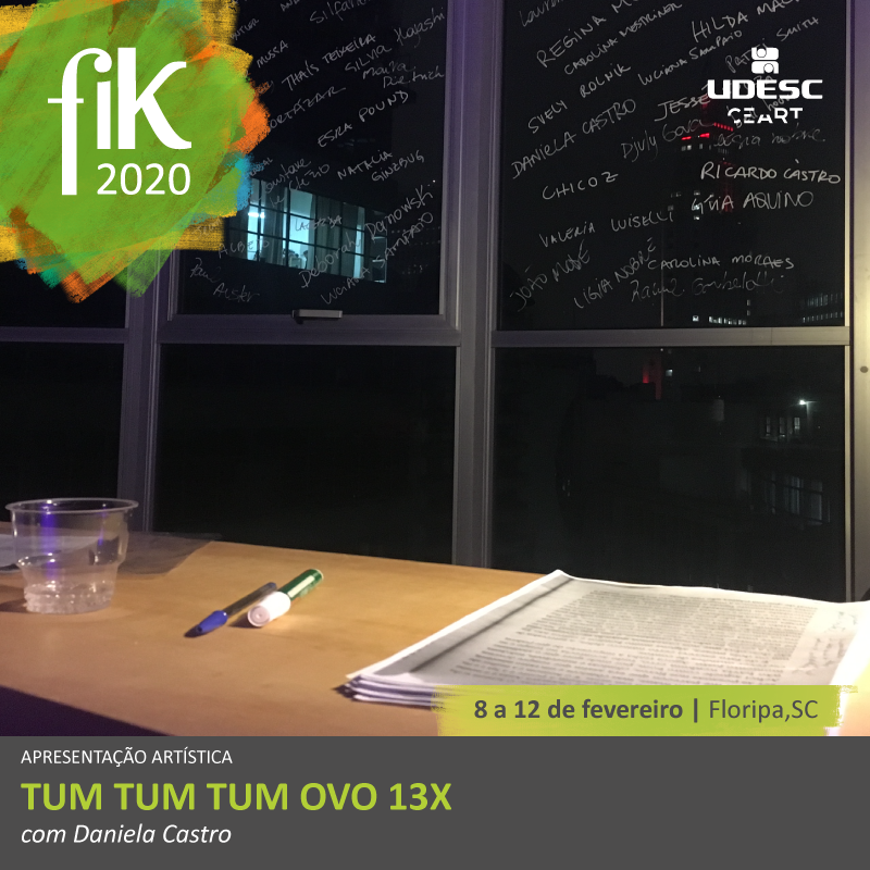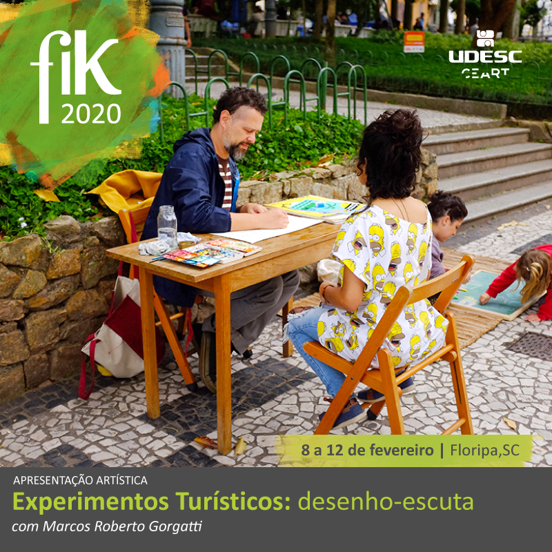Sinopse: A ação “desenho-escuta” consiste no convite ao público para uma conversa sobre algum lugar/paisagem da ilha ou continente que lhe seja significativamente importante. Um desenho é realizado conjuntamente a partir de linhas, volumes, formas e palavras compostos sob o efeito do fluxo da conversa. A proposta é um convite à partilha de afetos e memórias que surgem em meio à paisagens (turísticas ou não) permeadas por questões políticas, sociais e etc. pertencentes à vida real inserida na paisagem urbana, do campo ou da praia e que se distanciam das imagens-clichê da indústria do turismo.