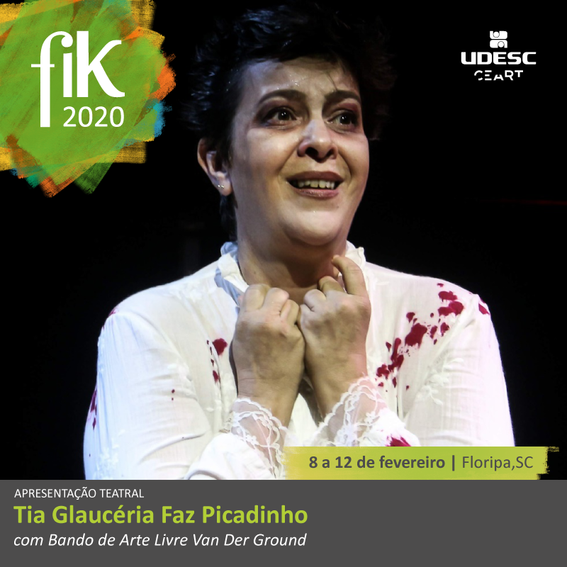 Sinopse: O Bando de Arte Livre Van Der Ground apresenta o espetáculo teatral “Tia Glaucéria faz picadinho”, que é resultado de uma parceria do Bando com a Cia Carnívora. O texto de Neumar Michaliszyn, faz uma sátira às condições da educação no Brasil além de abordar outros temas como relacionamento abusivo, violência contra mulher e a solidão. Tia Glaucéria é uma professora que, casada com a própria profissão, é aposentada devido a um surto em sala. Insatisfeita, percebe que precisa reaprender a viver sem aulas, o que a leva a redescobrir-se e realizar mudanças até então impensáveis. Conduzindo-nos através de uma trama cheia de loucura e horror, revelando, assim, sua verdadeira personalidade, anteriormente soterrada sob a máscara social da professora queridinha.