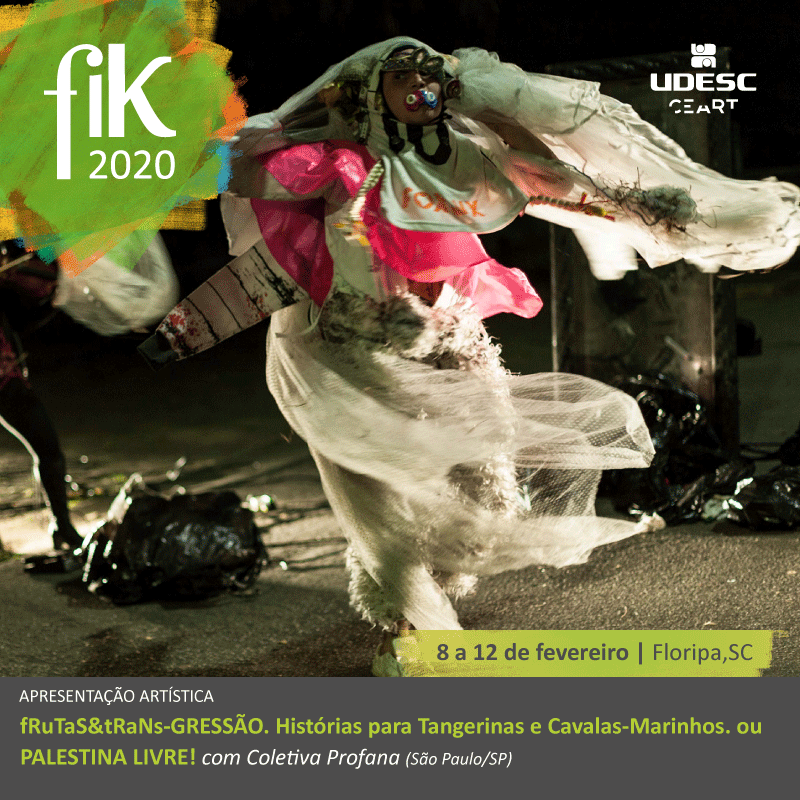 Sinopse: fRuTaS&tRaNs-GRESSÃO. Histórias para Tangerinas e Cavalas-Marinhos.ou PALESTINA LIVRE! é uma obra performática autoral com execução de trilha sonora ao vivo. Em "cena" temos Tangerine, a personagem dessa obra. [ Is this a work of art? ] Sozinhe ela não é mulher, nem homem nem travesti. Talvez uma drag não binárie bicha afeminade agressiva que canta e dança mágoas em seu talk show solitário. Isso não importa. O necessário é reconhecer que esse corpo é favelada brasileiro e canta, mesmo que em dias desafinados. Tangerine se desnuda frenética para que aceitem seu corpo e a deixem existir. Híbrida. Desobediente. Como cavalas-marinhos!