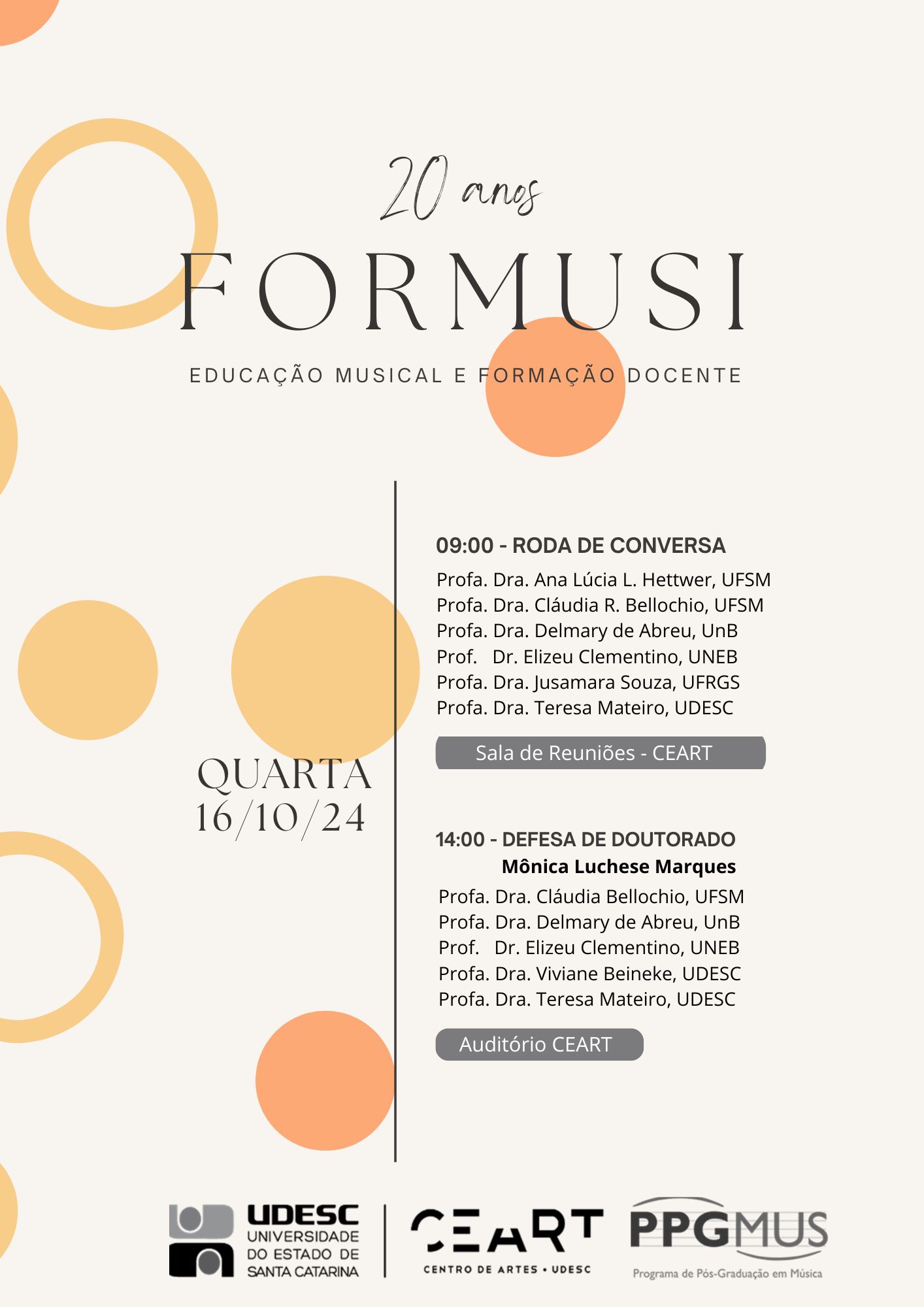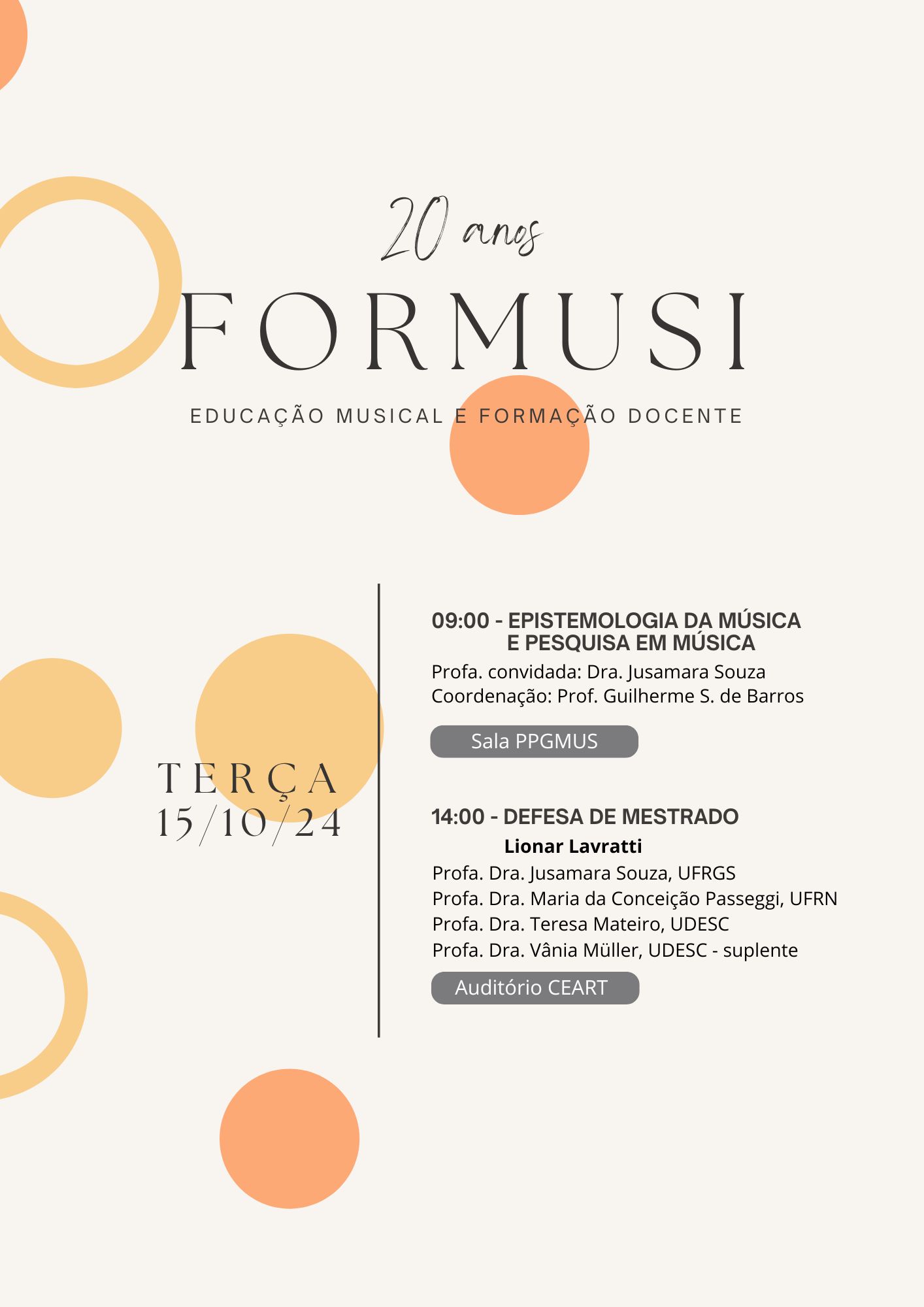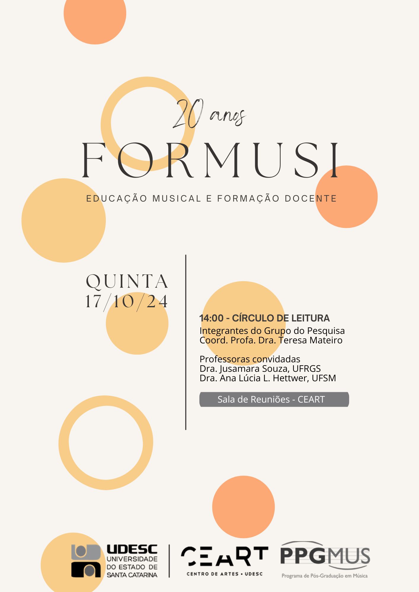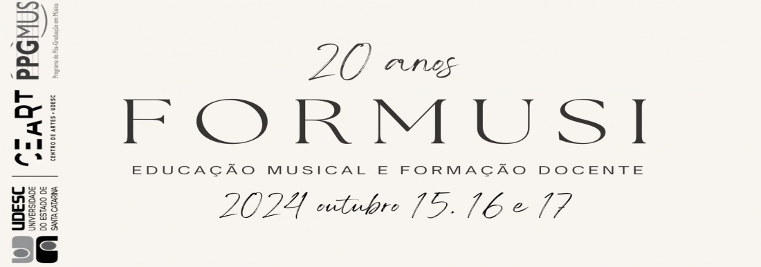 O Grupo de Pesquisa Educação Musical e Formação Docente (ForMusi/Diretório CNPq), em atividade oficialmente desde 2004, comemora 20 anos de atividades com estudantes do Departamento de Música (DMU) e do Programa de Pós-Graduação em Música, Mestrado e Doutorado (PPGMUS) e do Programa Profissional em Artes (PRO-ARTES), do Centro de Artes, Design e Moda (CEART), da Universidade do Estado de Santa Catarina (UDESC). Nesse período, participaram do grupo mais de 70 estudantes, incluindo também bolsistas e voluntários de Iniciação Científica. Professores e professoras de música, que trabalham em escolas da rede pública de educação básica e que acompanham o ForMusi, enriquecem significativamente os estudos do grupo. Não posso deixar de me remeter a colegas de outras universidades brasileiras e de outros países que integram e contribuem imensamente com ideias, pesquisas, publicações, conversas e lutas constantes na e pela educação musical. Todas as pessoas que passaram, as que permaneceram e as que estão no momento são presentes que recebi em minha carreira docente e em minha trajetória de vida. Sublinho, com toda a certeza, que sempre foi um enorme prazer trabalhar com o grupo.