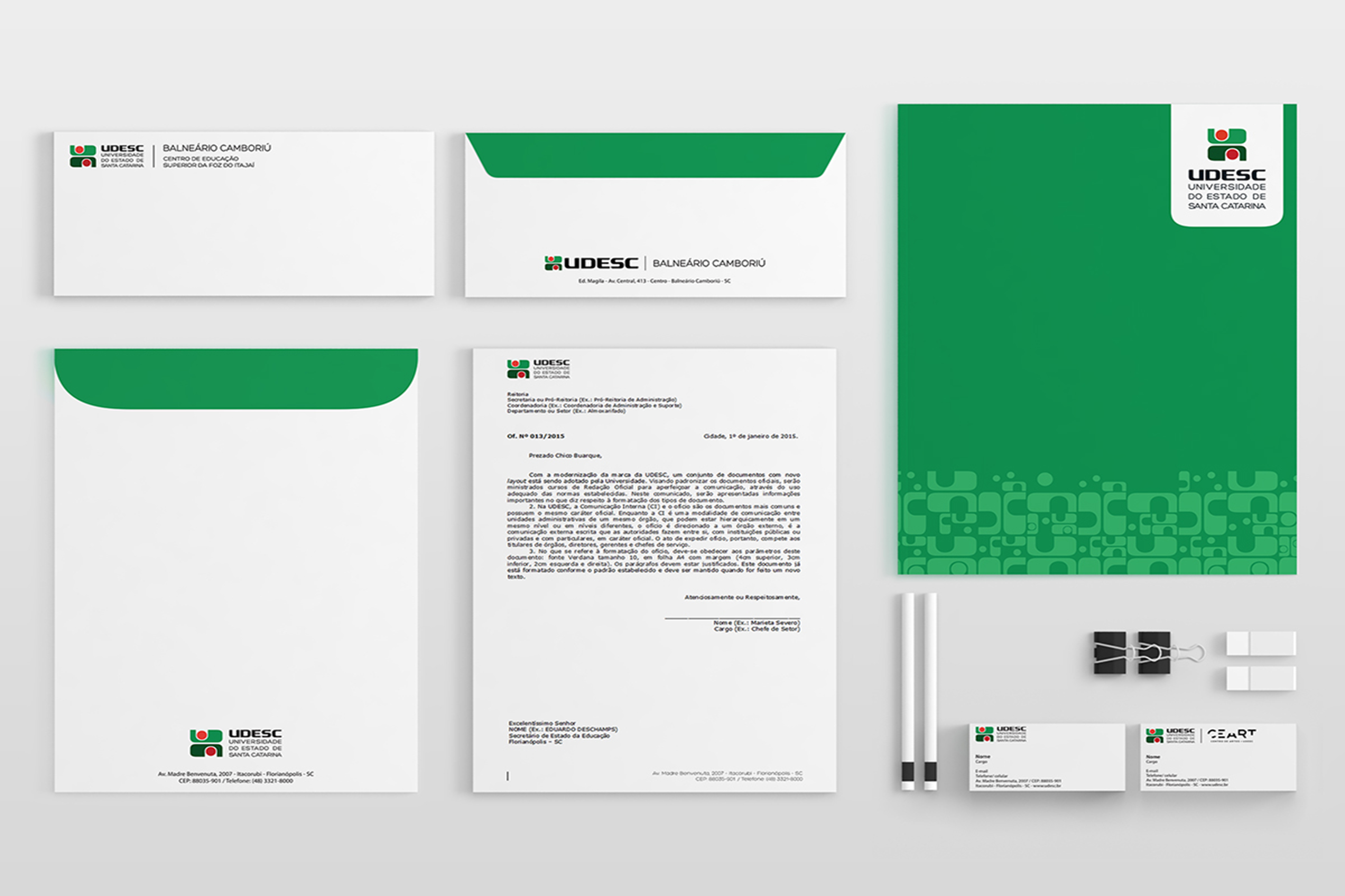 - O projeto de redesign da marca Udesc incluiu uma pesquisa com participação da comunidade acadêmica, desenho da nova marca e elaboração do manual com as normas de uso. Ele envolveu, ainda, a assinatura conjunta da marca Udesc com as marcas dos centros e com os setores e pró-reitorias. Também foram elaboradas as principais aplicações gráficas: modelos dos documentos oficiais, cartão de visitas, pasta, envelopes e carteirinha.