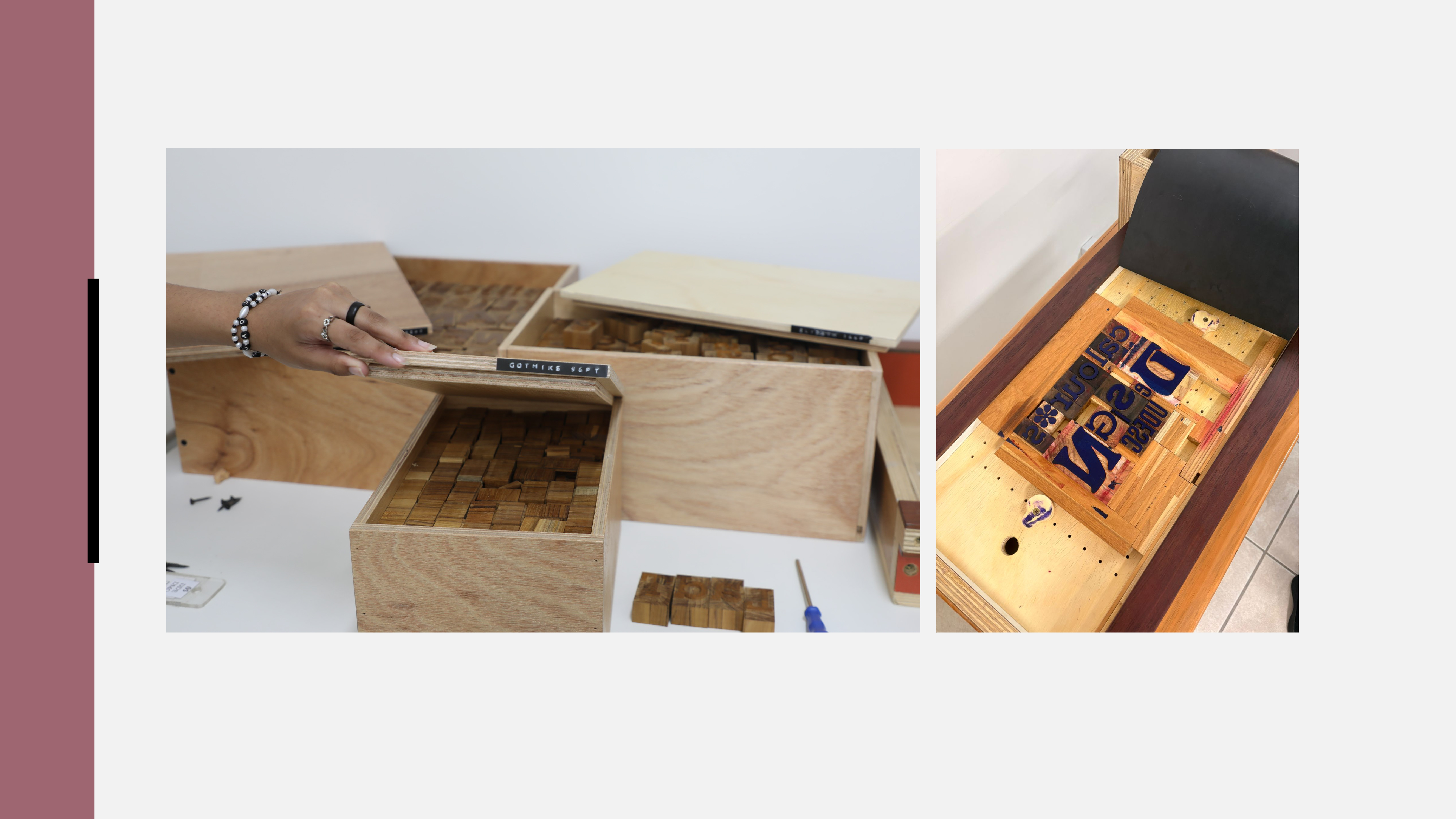 Além do material de composição, o laboratório conta com kits de brancos para as composições e tintas tipográficas, três rolinhos de impressão e três espátulas disponíveis para impressão.
