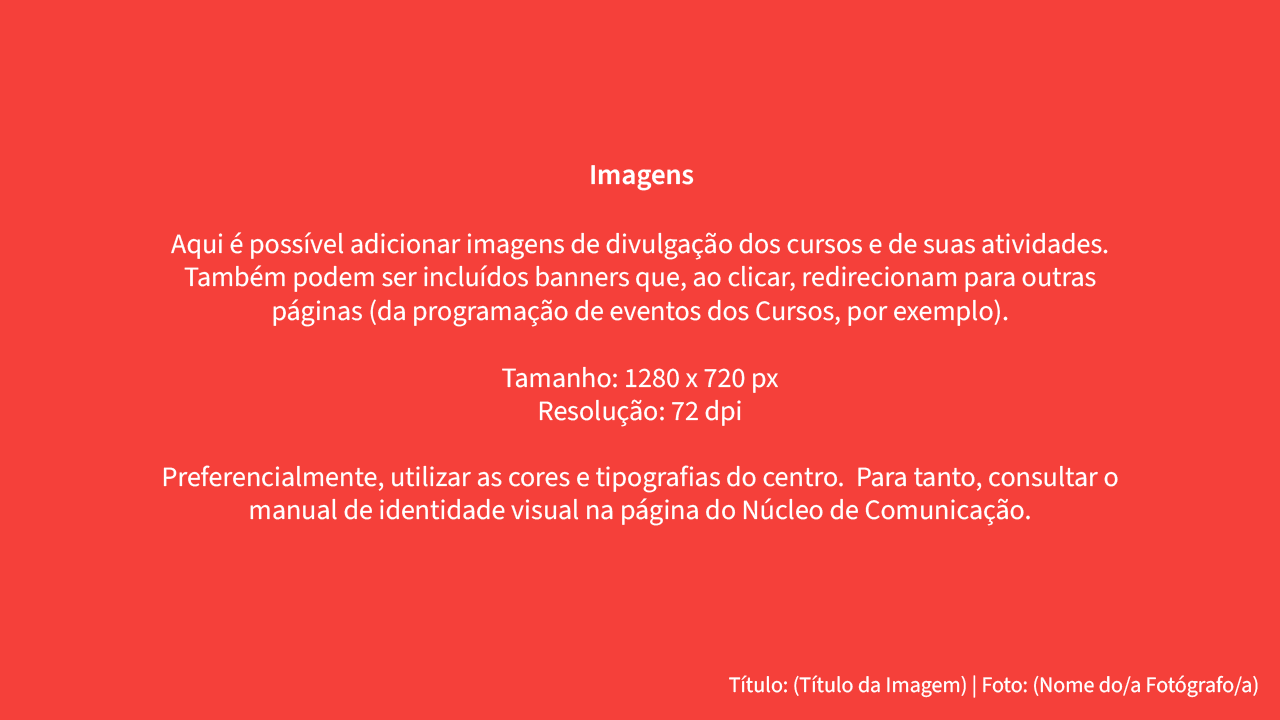Este é um modelo para a reestruturação das páginas dos programas de pós-gradução. Por que realizar essa reestruturação? Para facilitar o acesso dos/as visitantes do site (discentes, docentes, técnicos, técnicas e comunidade externa) às informações; padronizar as páginas do centro; otimizar essas páginas para dispositivos móveis; aumentar a inclusão e acessibilidade; e evitar que sejam fornecidas informações desatualizadas ou imprecisas.