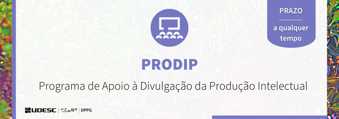 O Programa de Apoio à Divulgação da Produção Intelectual – PRODIP/CEART visa ao fomento da difusão da produção intelectual de caráter científico, tecnológico e artístico da UDESC e propiciar a aquisição de conhecimentos específicos imprescindíveis ao desenvolvimento da pesquisa. O PRODIP tem por finalidades: