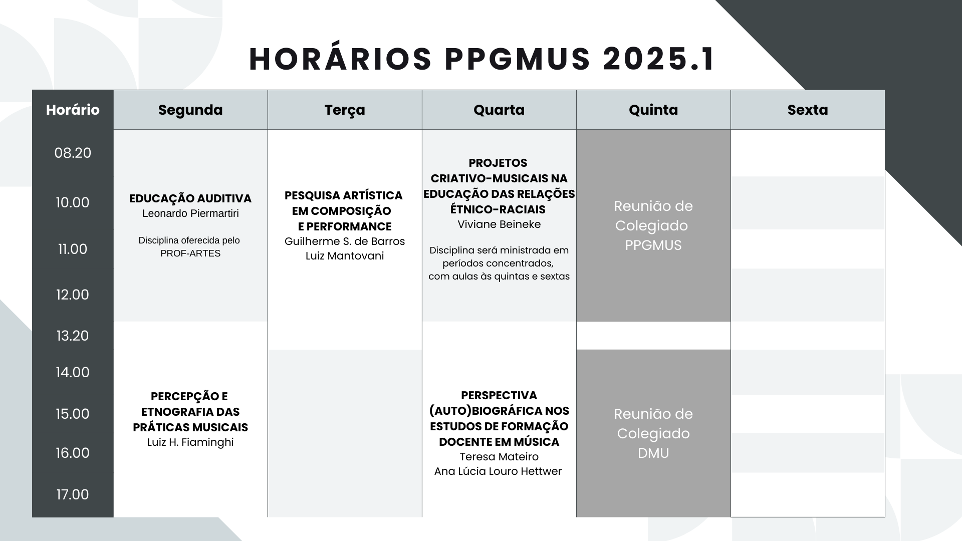 2026 - Com exessão da disciplina Pesquisa em Música, as aulas do PPGMUS ocorrerão na sala 108 do DAC.