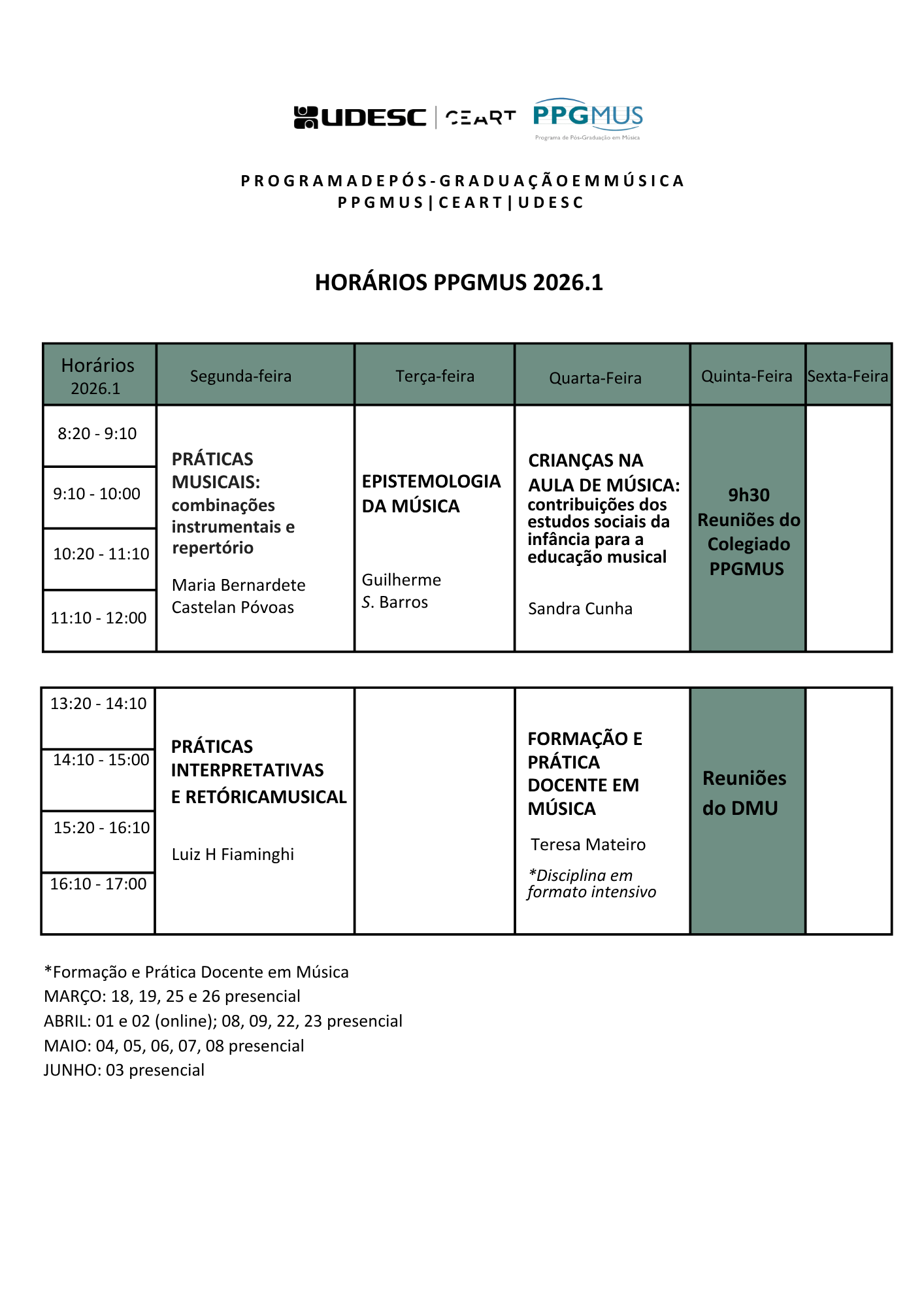 QUA | 13h20 - 18h | FORMAÇÃO E PRÁTICA DOCENTE EM MÚSICA | 4 créditos |