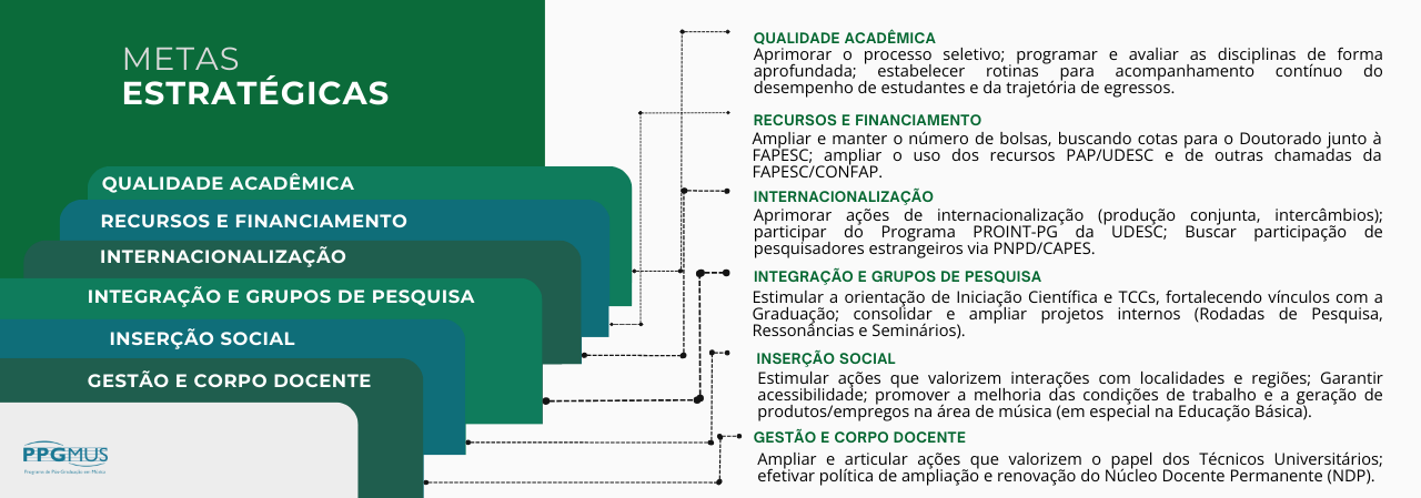 O planejamento estratégico do PPGMUS está vinculado e é coerente com as diretrizes da UDESC, atendendo a quatro documentos institucionais-chave: