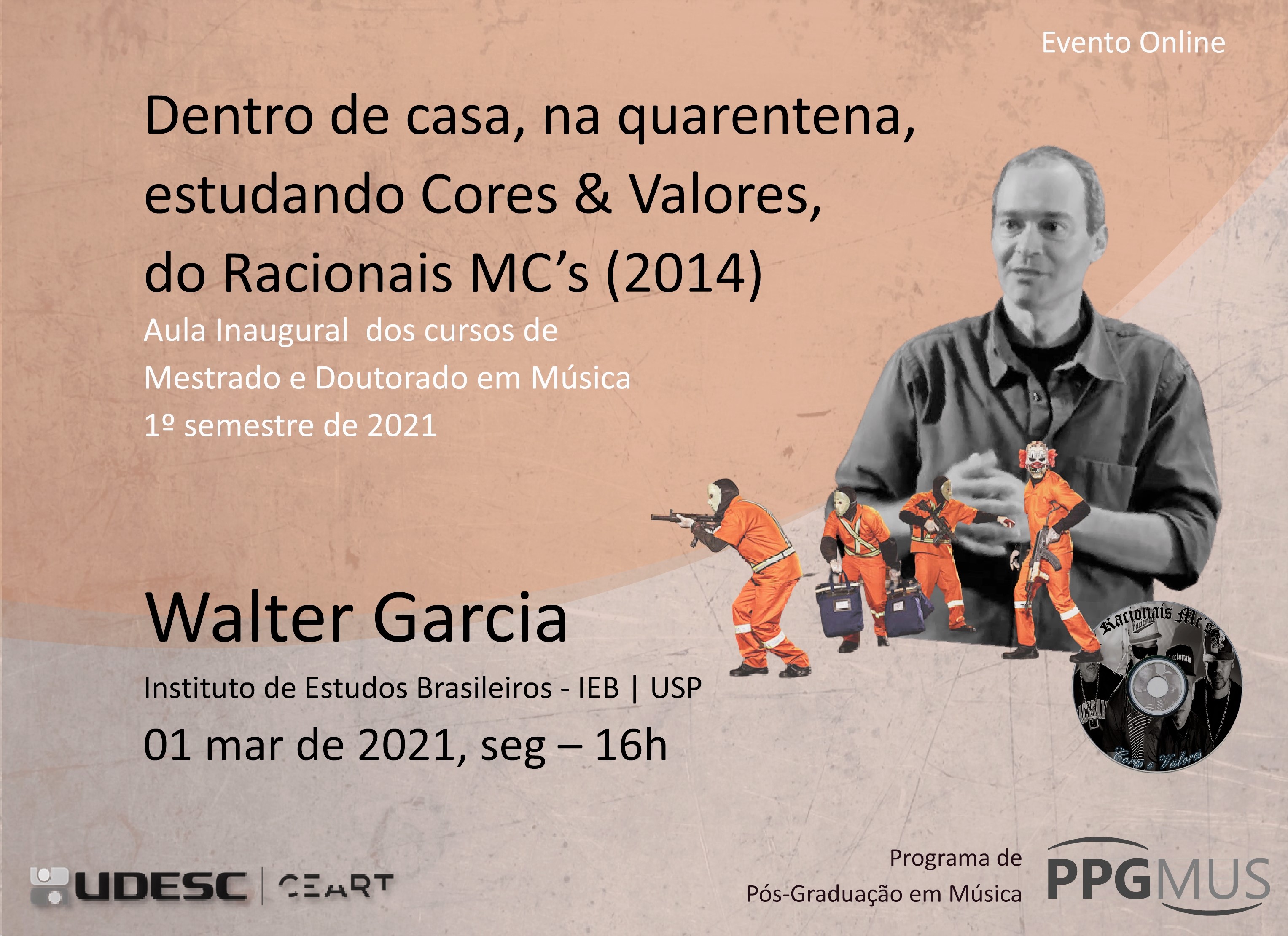 A aula discutirá a forma de Cores & Valores, do Racionais MC’s (2014). Em chave interdisciplinar, a noção de “forma” se refere tanto à análise da estrutura sonora (relação entre os elementos musicais, poéticos e performáticos) quanto à interpretação dos sentidos dessa estrutura (buscados nas relações entre a forma e as singularidades do processo histórico, com atenção ainda a diálogos que Cores & Valores estabelece com outras obras). A situação imposta pela pandemia de Covid-19 será abordada como um dos fatores que influenciam atualmente a crítica do disco.