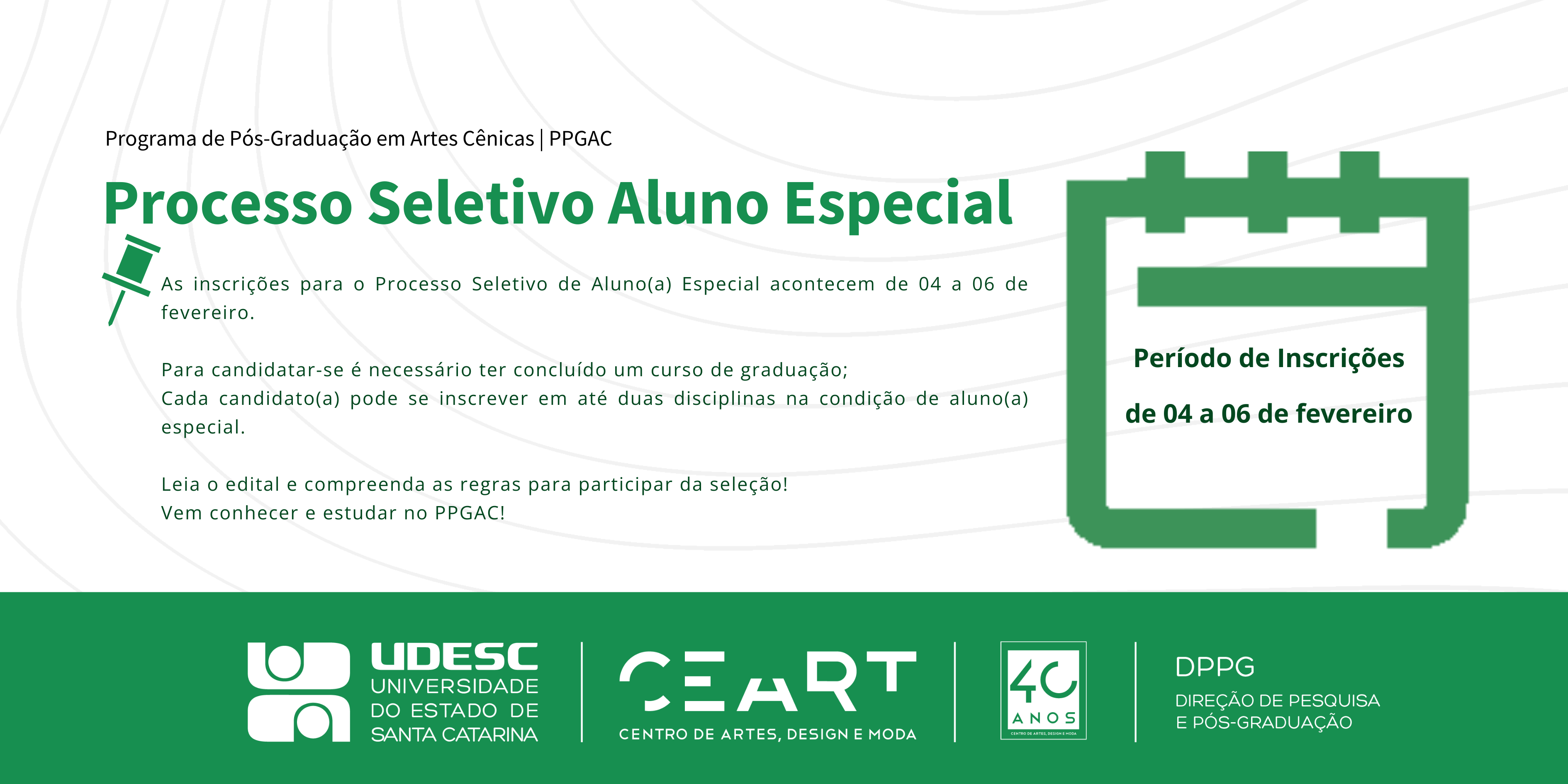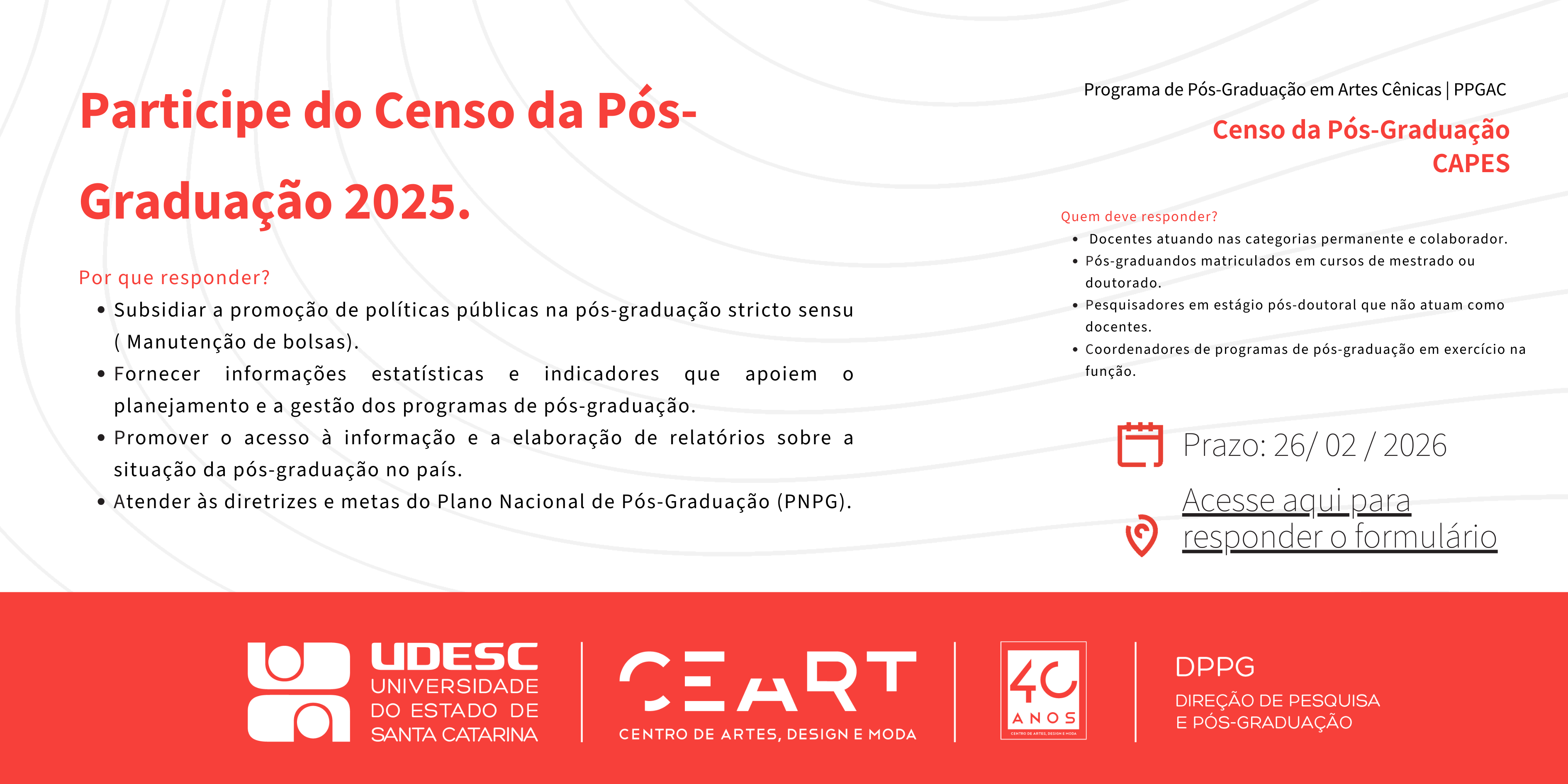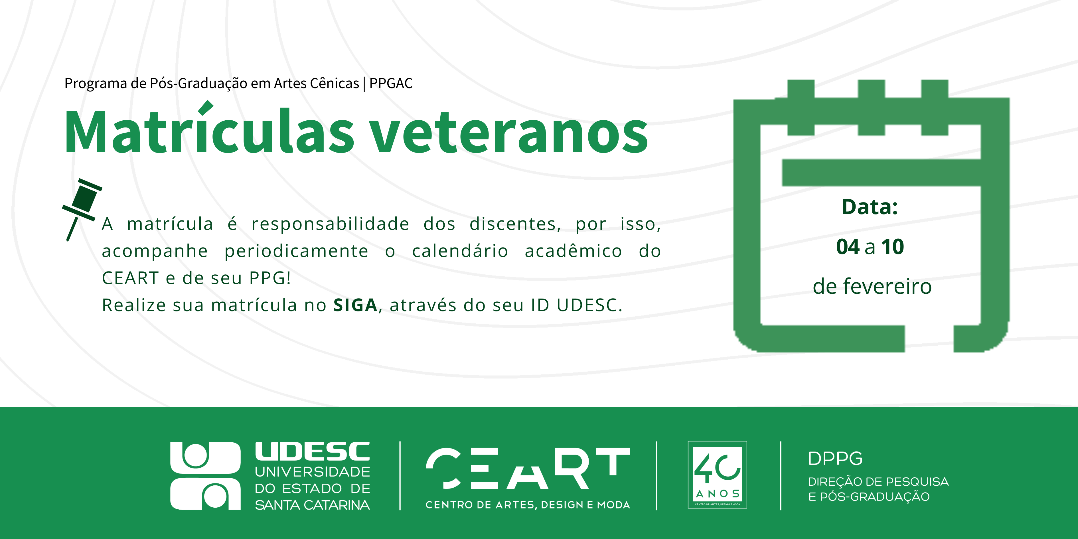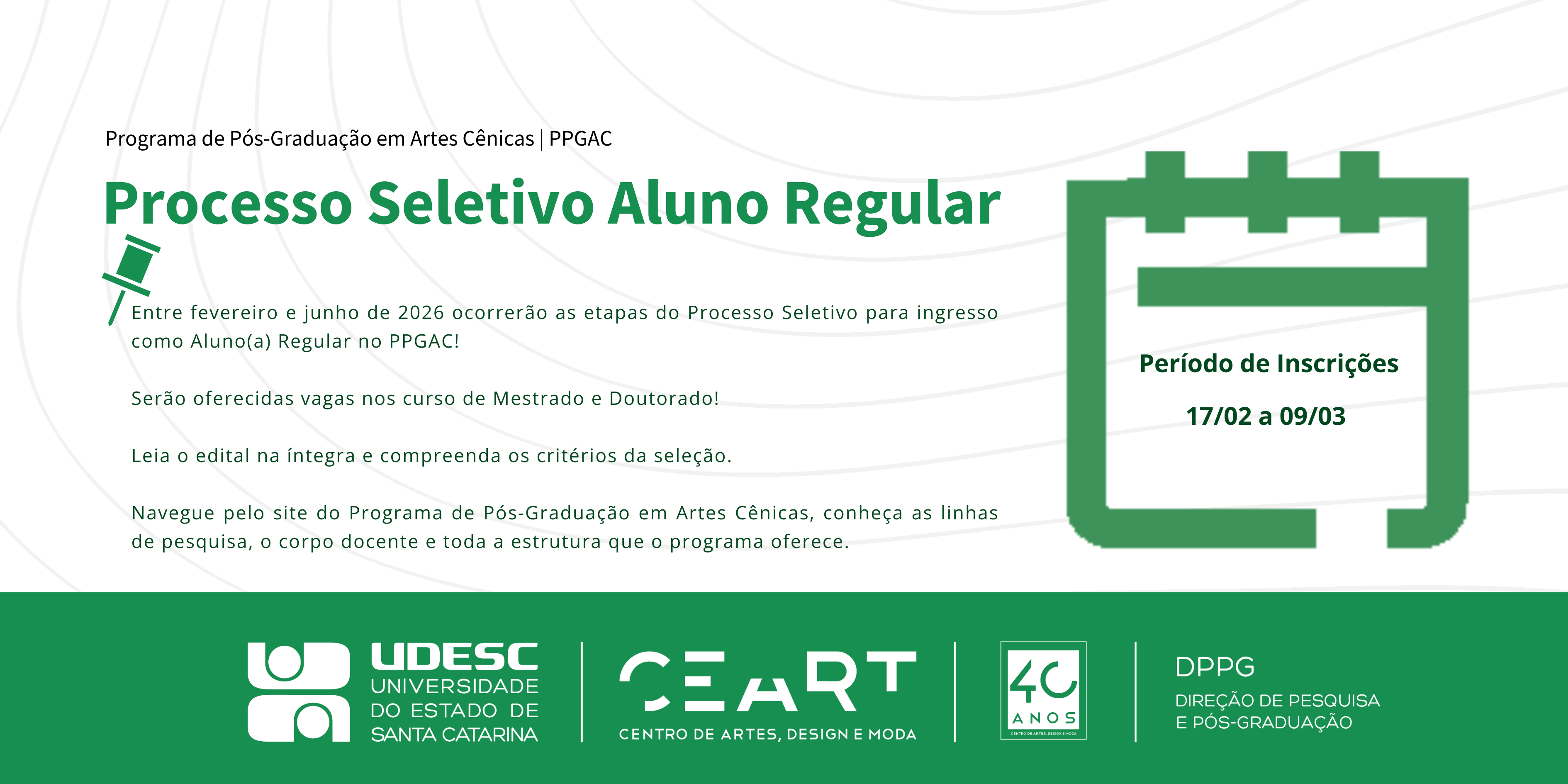 Horários de atendimento deverão ser agendados previamente na Secretaria do PPGAC ou pelo e-mail ppgac.ceart@udesc.br