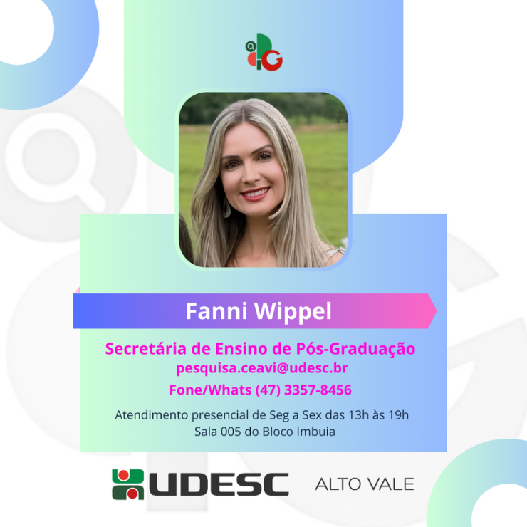 Fanni Wippel Secretária de Ensino de Pós-Graduação Telefone WhatsApp: (47) 3357-8456 Ver email