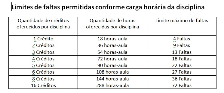Verifique a carga horária de suas disciplinas e após acesse aqui para verificar o limite máximo de faltas permitidas.